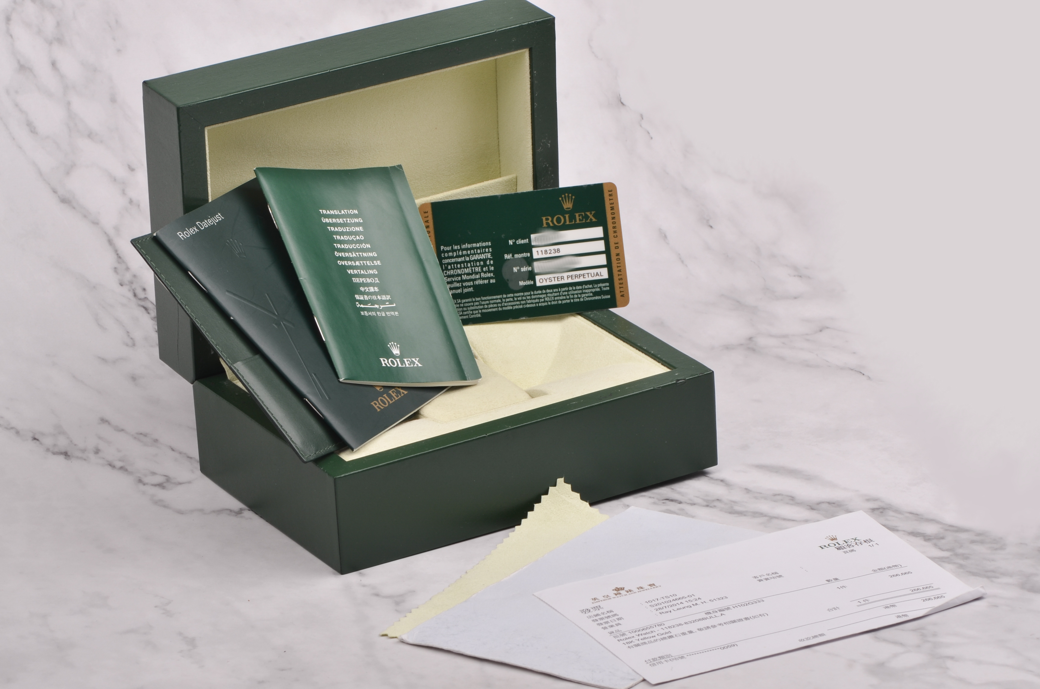 附件齐全,原厂表盒,皮卡套,说明书,服务手册,保修卡(2014年7月),购买发票。乱码字头表。