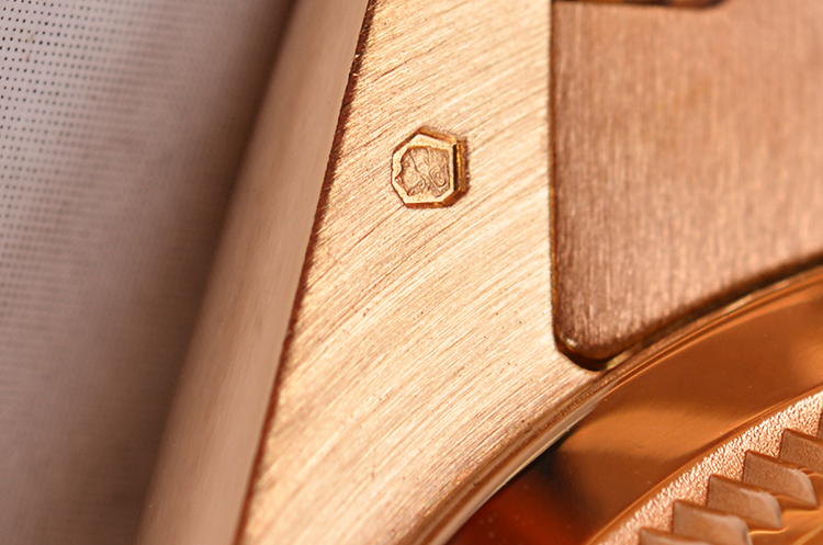 奢华的18K全黄金表壳及链带,专利隐藏式折叠表扣。圣伯纳狗头印记。蓝宝石水晶镜面,黄金三角坑纹表圈,稀有立体天然牛眼石面盘,10颗大包钻刻度(其中6、9时位置为长条钻),黄金指针。旋入式防水表冠。口径36MM*11MM。防水100M。