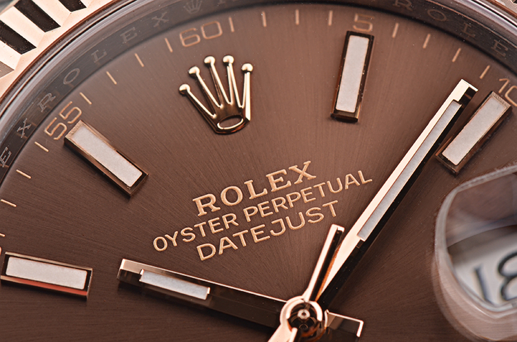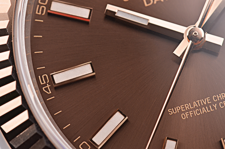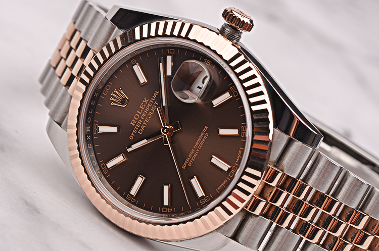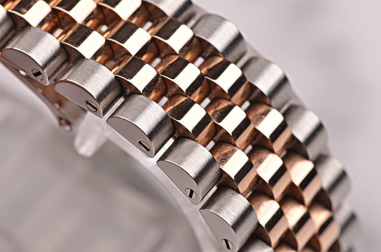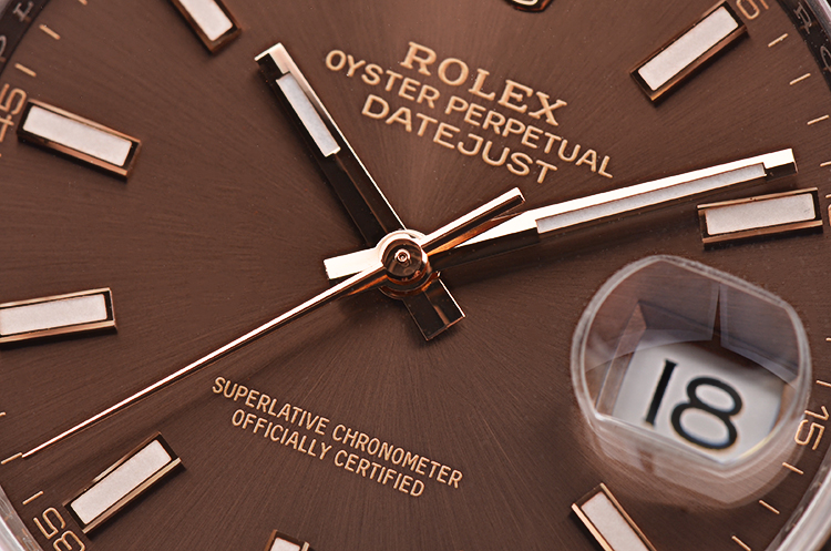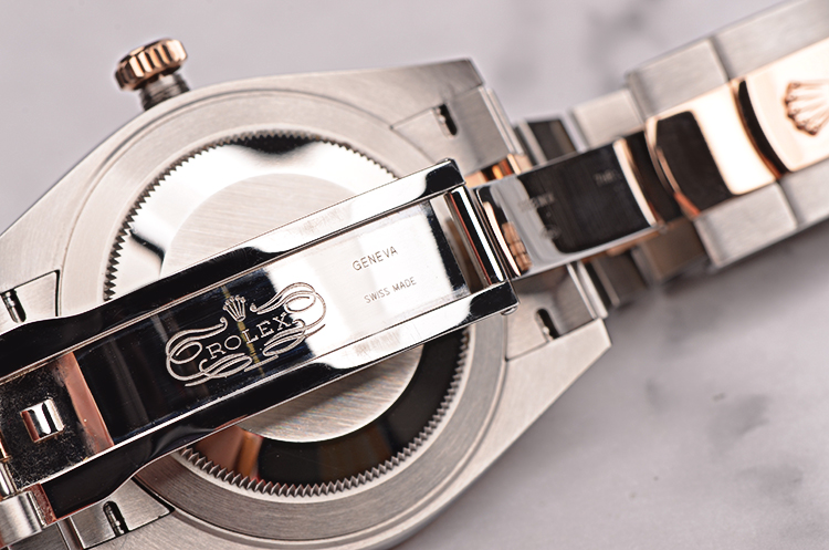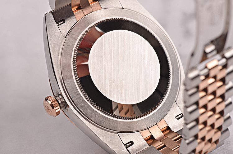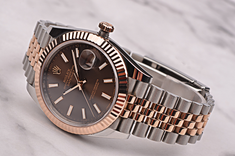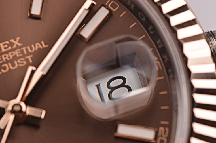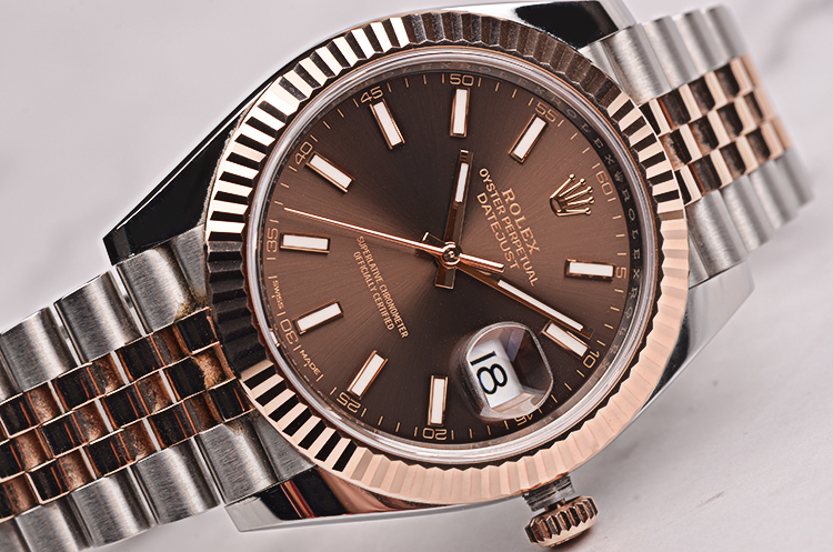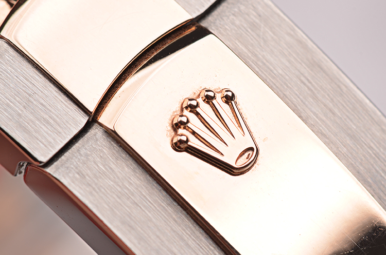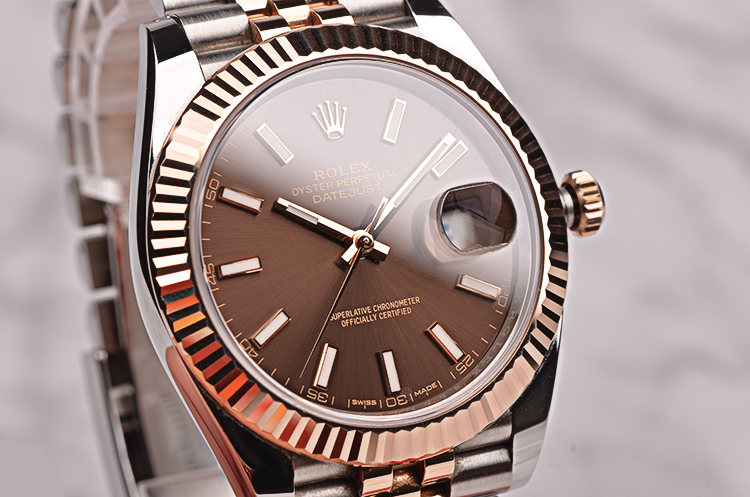 904L精钢及18K玫瑰金表壳及链带,折叠式表扣。18K玫瑰金三角坑纹表圈,蓝宝石水晶镜面,立体巧克力色表盘,玫瑰金夜光指针及刻度。3点位放大镜日历视窗。旋入式防水表冠。口径41MM*12.8MM,防水100M。