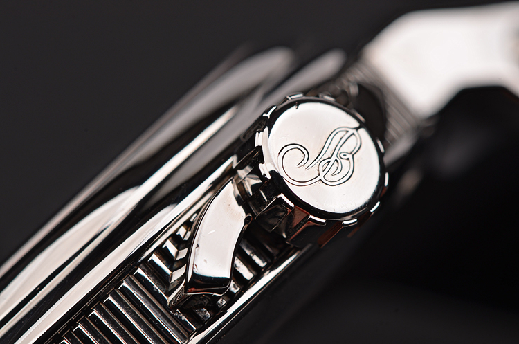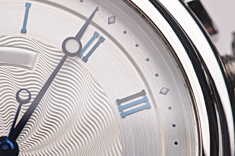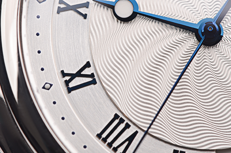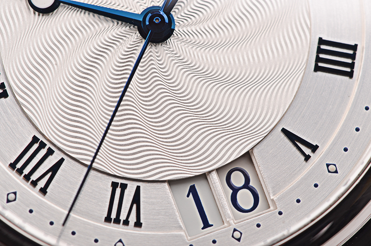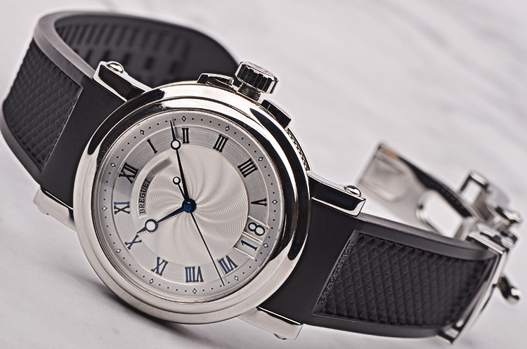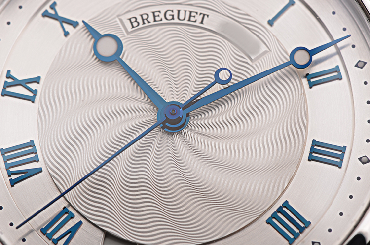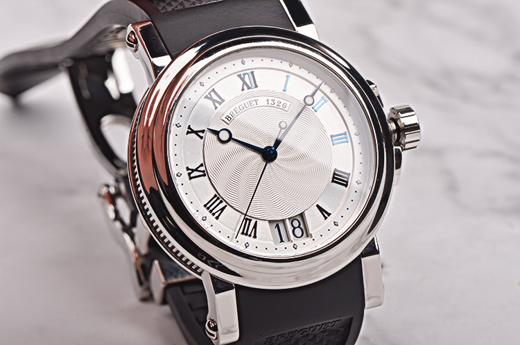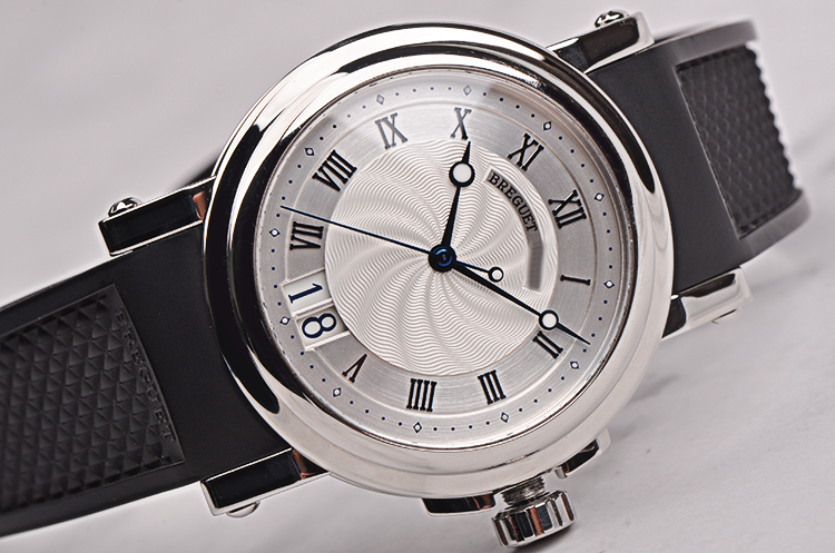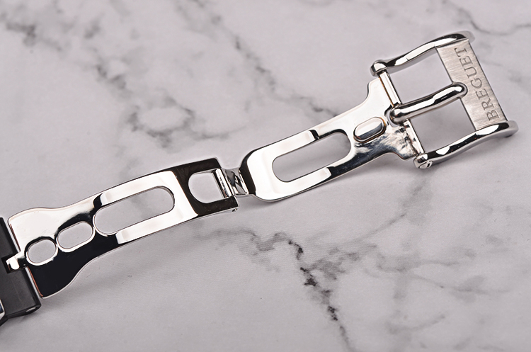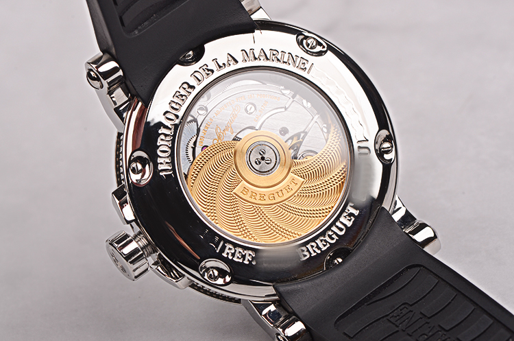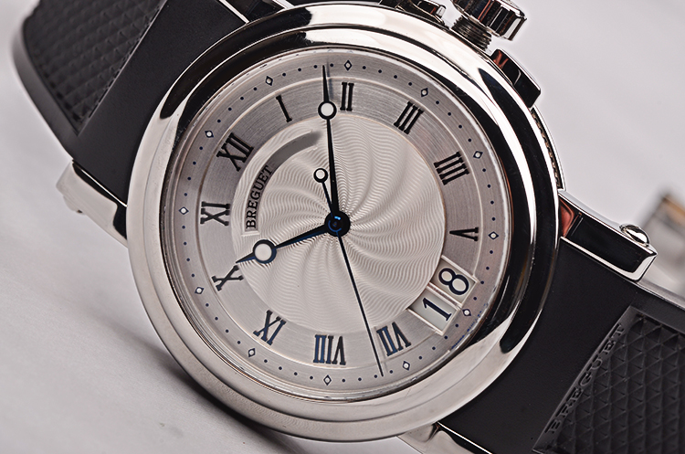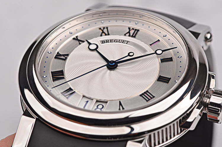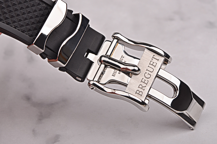 精钢宝玑钱币纹表壳及折叠式表扣,原装黑色橡胶表带成色很新。蓝宝石水晶镜面及底盖,立体白金镀铑表盘带手工镌刻图案,蓝钢罗马字刻度及指针,6点位大日历视窗。口径39MM*11.82MM。旋入式防水表冠。防水100M。
