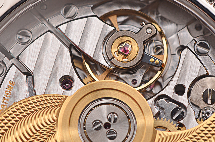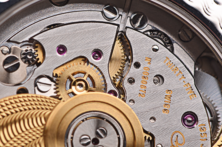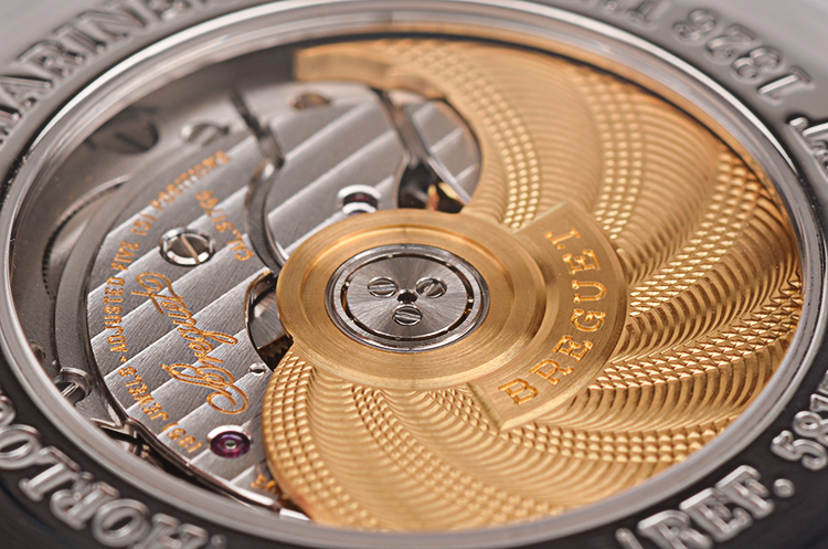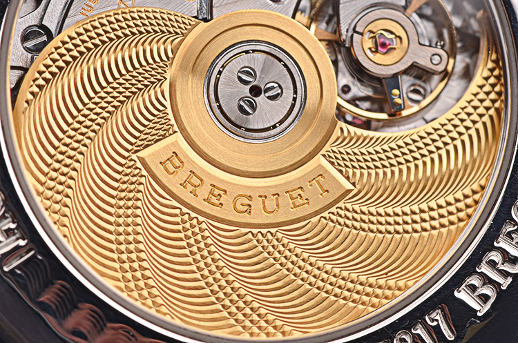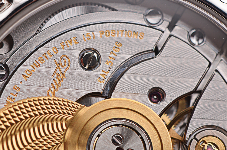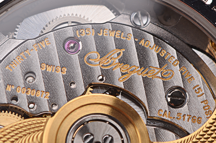宝玑自产CAL.517GG型机芯,自动机械,由285个零件组成,极其精致日内瓦条纹打磨,倒角抛光修饰。35钻,摆频28800,5方位校正,动力储存约65小时。手工镌刻黄金自动摆陀。走时状态极嘉。