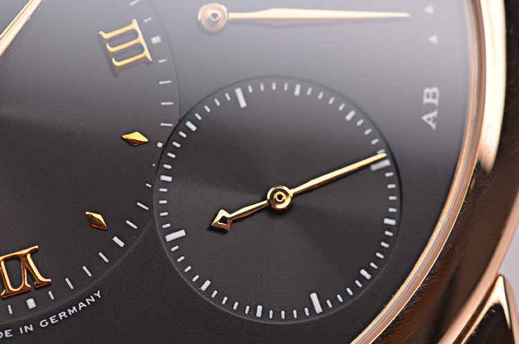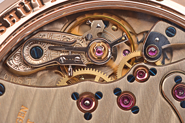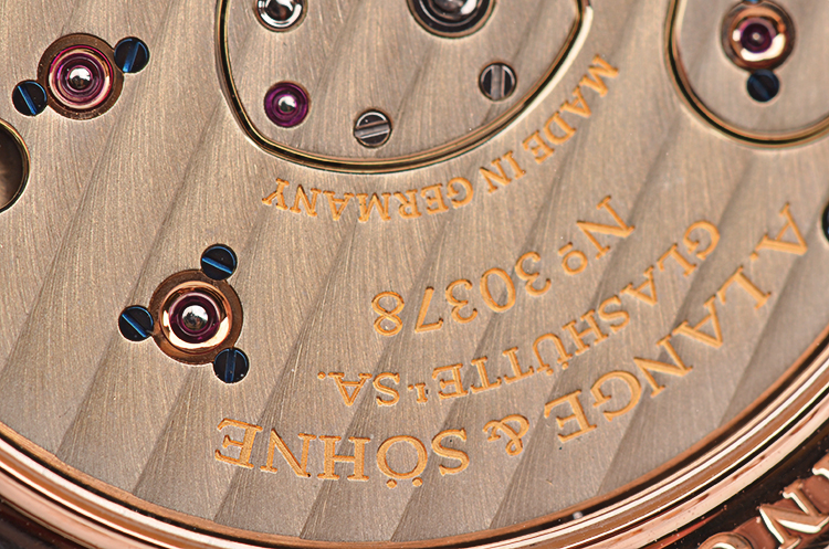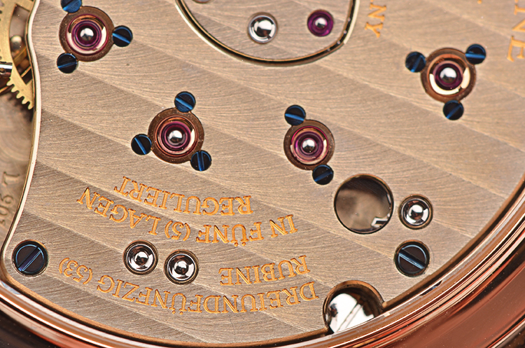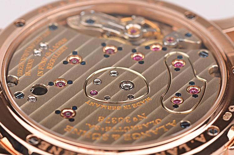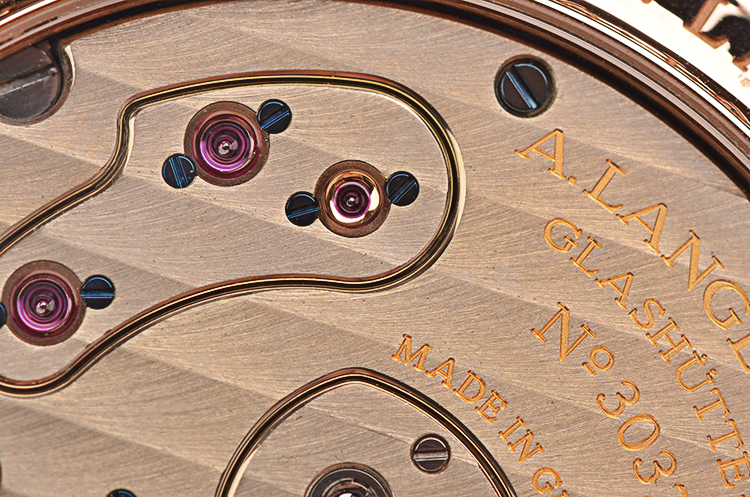 A. Lange & Sohne自产的CAL.L901.0型机芯,手上链,标准德式3/4大夹板机芯,德国银材质,极其精致人手打磨,倒角抛光修饰,蓝宝石固定红宝石轴承,黄金套筒,雕花鹅颈微调,汇集德式高级制表所有元素。由365个零件组成,53钻,摆频21600,5方位校正,动力储存约72小时(三天链),走时状态极嘉。