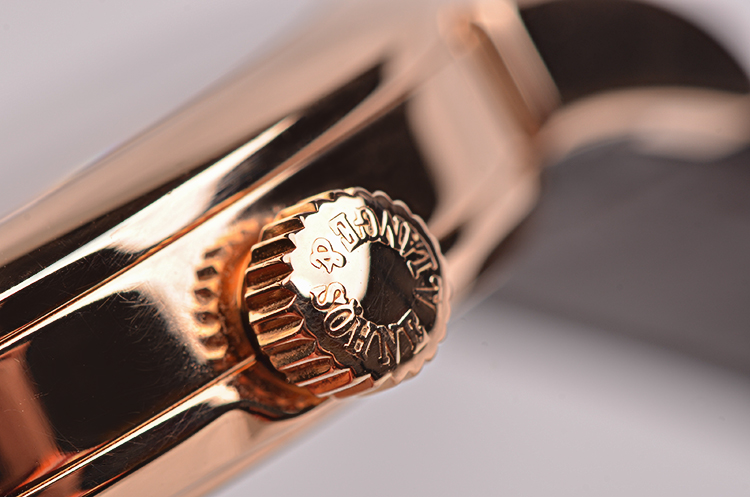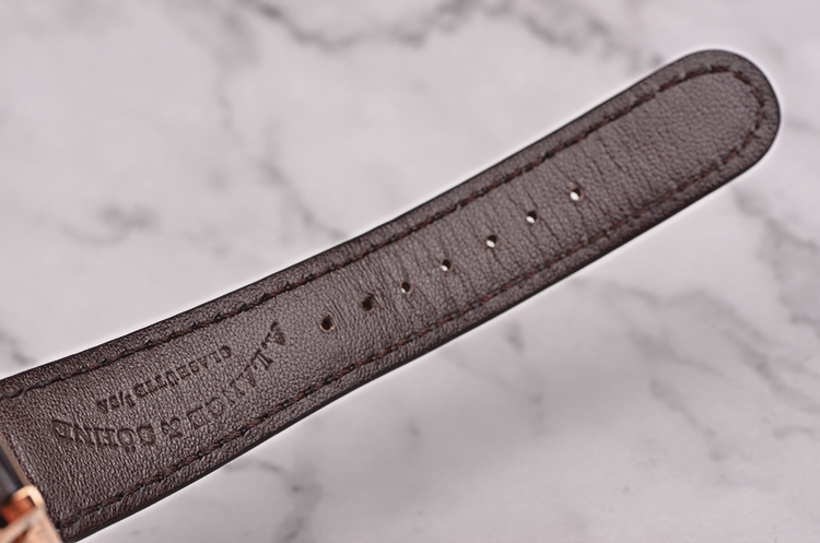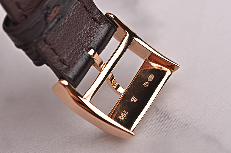 18K玫瑰金表壳及表扣,圣伯纳狗头印记。后配深棕色鳄鱼皮表带成色极新。蓝宝石水晶镜面及底盖,立体深灰色表盘,玫瑰金指针及刻度,偏心小三针设计,4点位独立小秒针,2点位大日历视窗,指针式动能储备显示功能。口径38.5MM*10MM,防水30M。