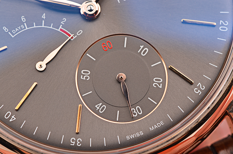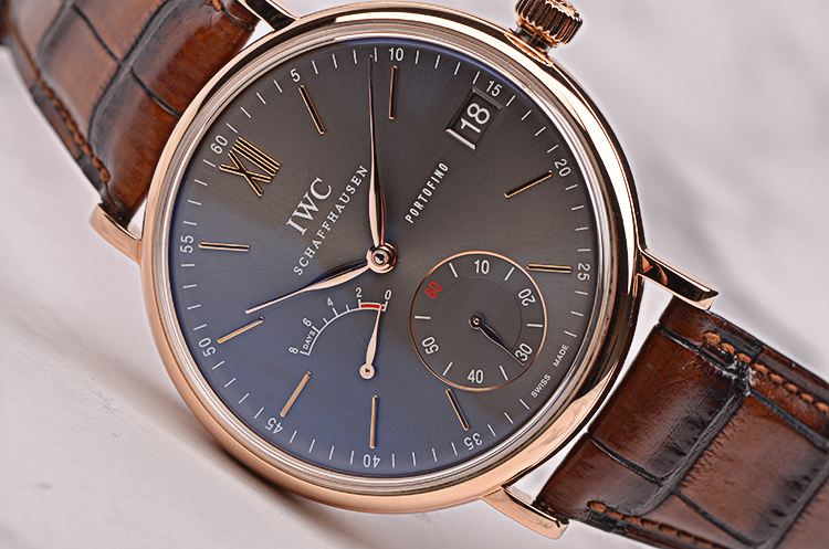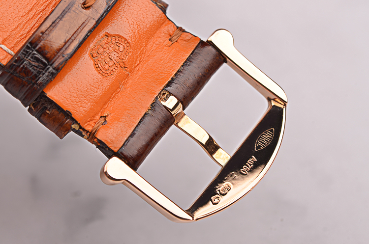 18K玫瑰金表壳及表扣,圣伯纳狗头印记。全新原装棕色渐变纹路鳄鱼皮表带。蓝宝石水晶镜面及底盖,立体灰色拉丝表盘,玫瑰金指针及刻度,小三针设计,9点位指针式八天动储显示,6点位独立小秒针,3点位日历显示功能。口径45MM*11.8MM。防水30M。