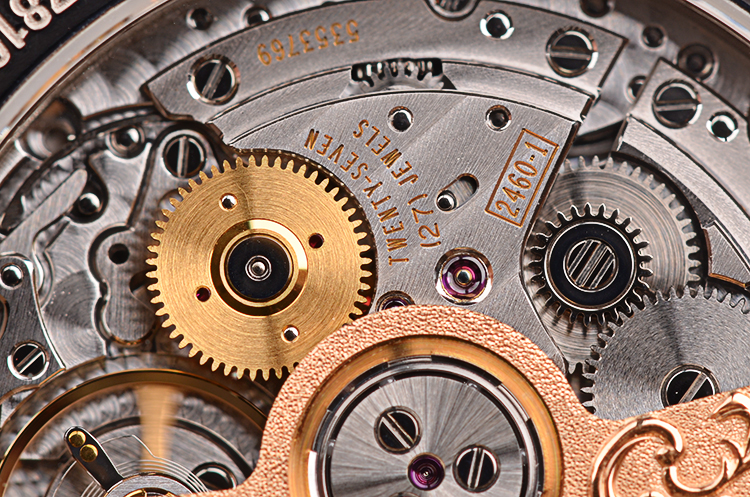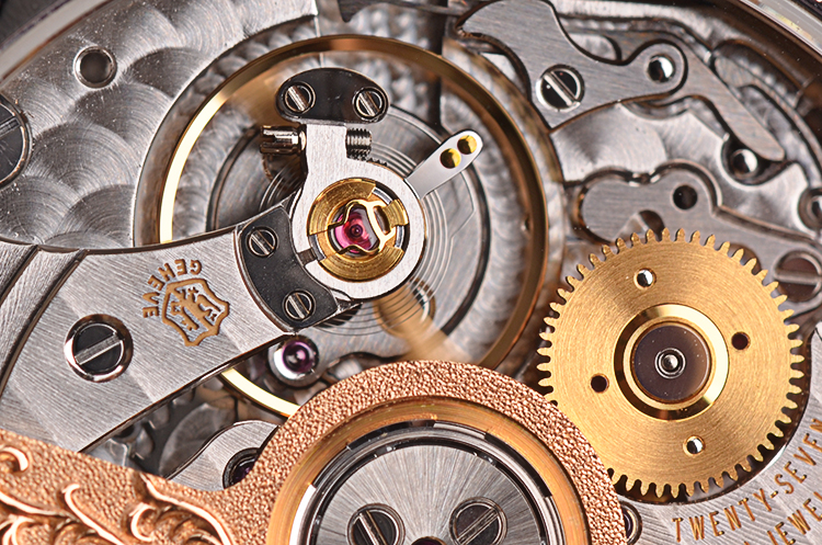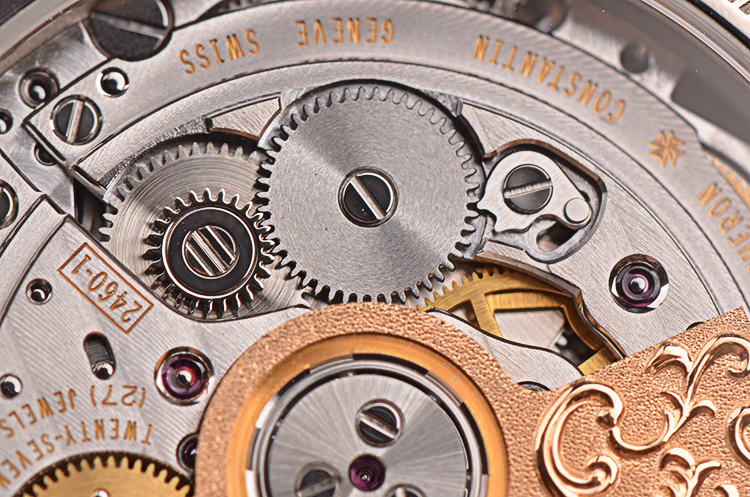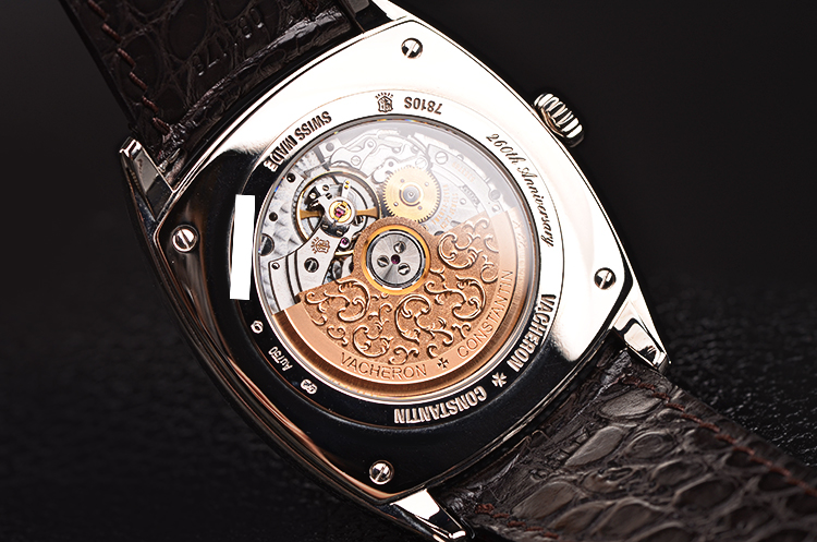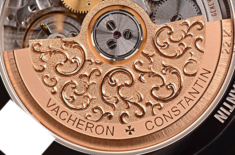 VC自产CAL.2460 DT型机芯,自动机械,极其精致日内瓦条纹打磨,倒角抛光修饰,日内瓦印记,由233个零件组成,27钻,摆频28800,5方位校正,22K金雕花自动转陀,动力储存约40小时。走时状态极嘉。