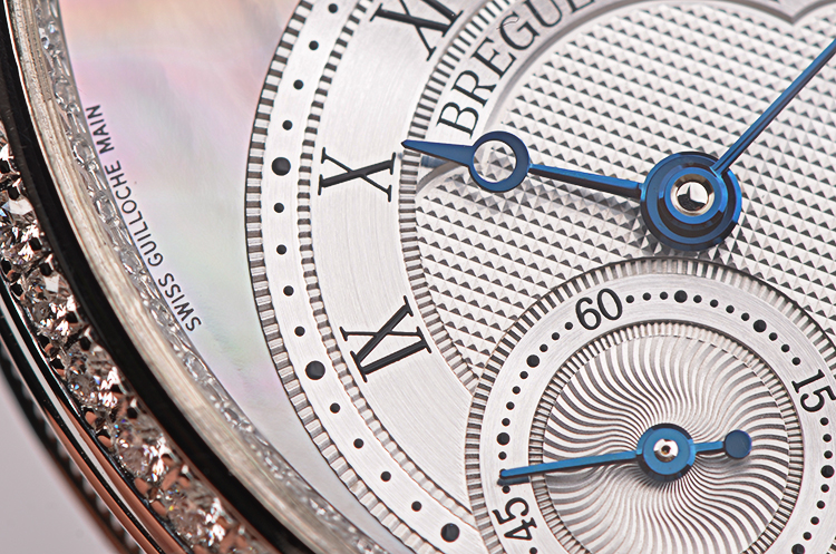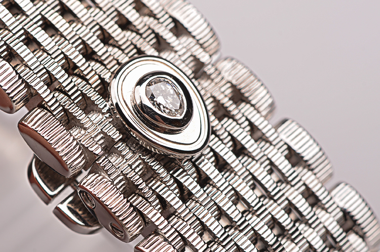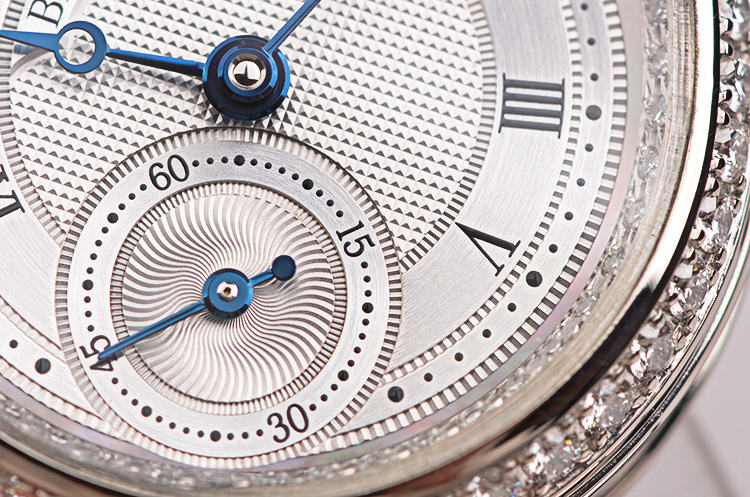 整体18K白金钱币纹表壳及流苏式样链带,18K白金双向按压式折叠表扣。圣伯纳狗头印记。表圈原厂镶嵌117颗鼎级威赛尔顿钻石,约0.99克拉。表耳镶嵌共计22颗美钻,表扣处则为一颗水滴形大钻。蓝宝石水晶镜面及底盖,立体黑色大溪地珍珠贝母及金镀银表盘,蓝钢宝玑针,罗马字刻度。12点位人脸月相及指针式动力储备显示,7点位独立小秒针。蓝色宝石表冠,口径36.5MM*28.45MM*10.05MM,相当于圆表36MM左右大小。防水30M。
