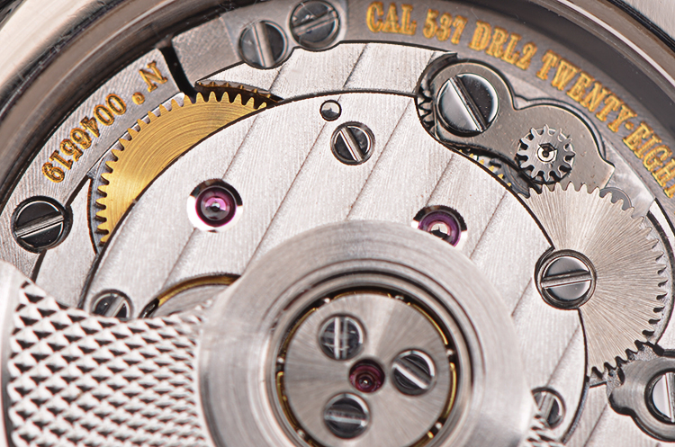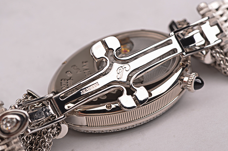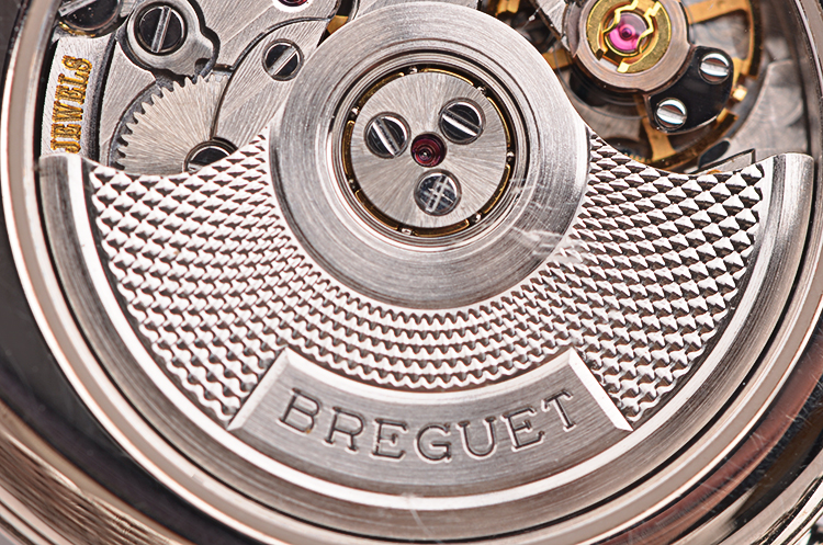 宝玑自产Cal.537DRL2型机芯,自动机械,极其精致日内瓦条纹打磨,倒角抛光修饰。28钻,摆频25200,18K白金镌刻自动转陀,动力储存约40小时,走时状态极嘉。