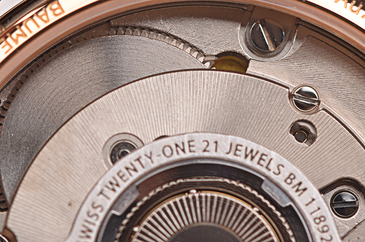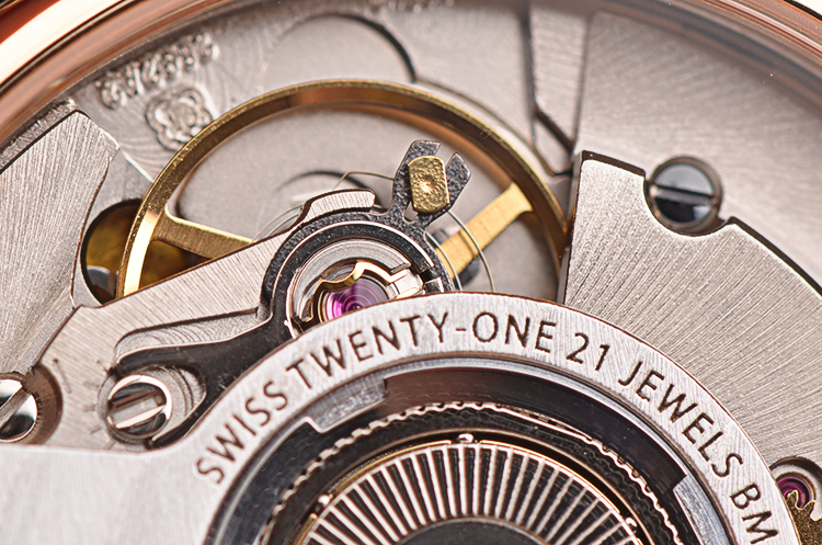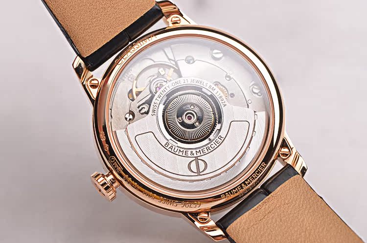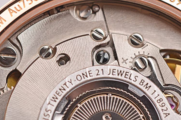 名士BM11892A型机芯,自动机械,精致日内瓦条纹打磨,21钻,摆频28800,动力储存约42小时。