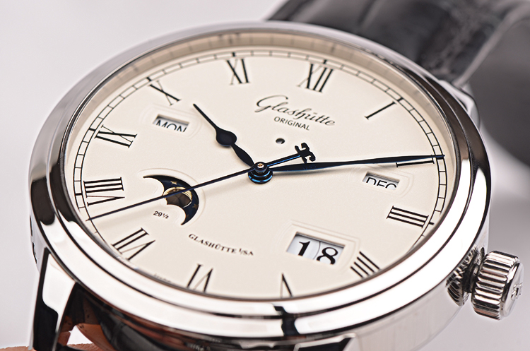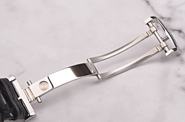 精钢表壳及折叠式表扣,原厂黑色路易斯安娜短吻鳄鱼皮表带成色很新。蓝宝石水晶镜面及底盖,立体白色表盘,蓝钢桃心指针,万年历,月相功能。口径42MM*13.6MM。防水50M。