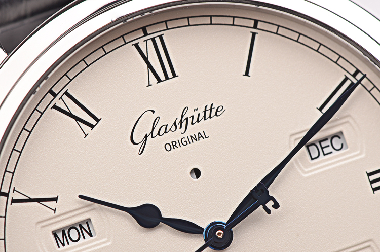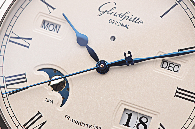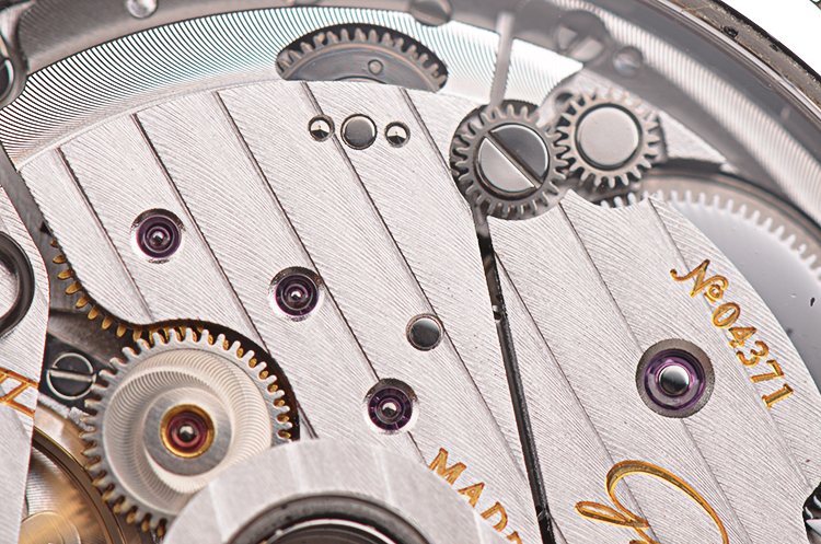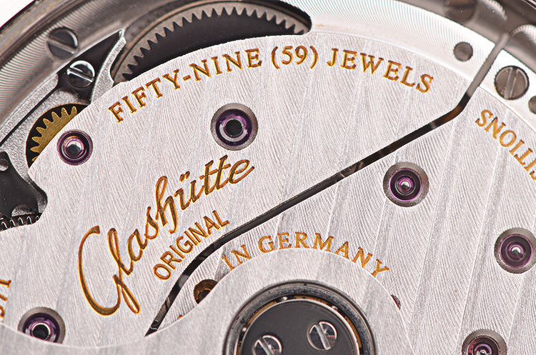 GO自产CAL.100-02型机芯,自动机械,标准德式3/4大夹板机芯,极其精致人手条纹打磨,59钻,摆频28800,鹅颈微调器,5方位校正,机芯独立签署,21K镂空黄金自动转陀配重。动力储存约55小时,走时状态极嘉。
