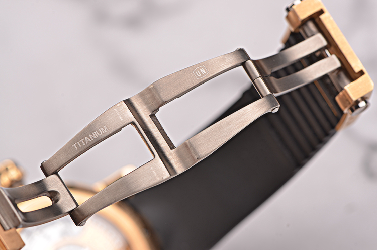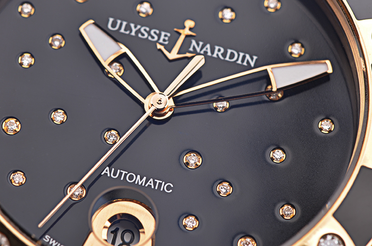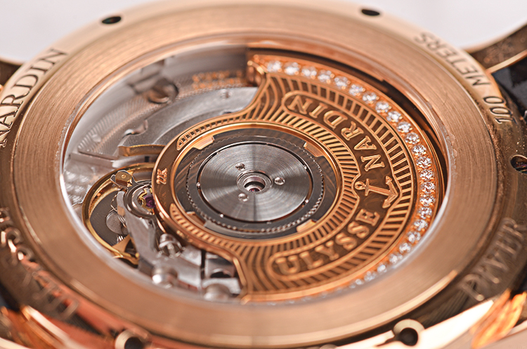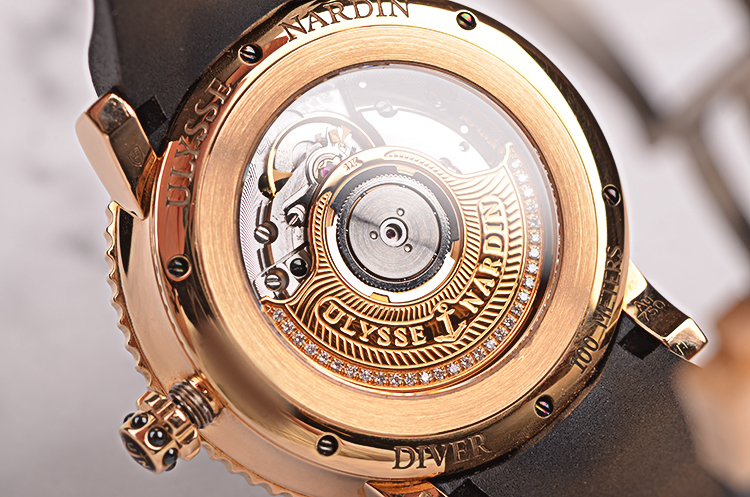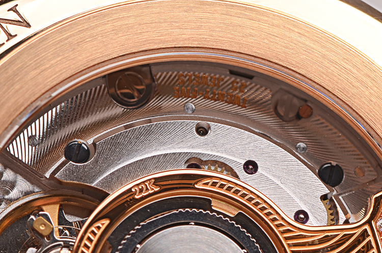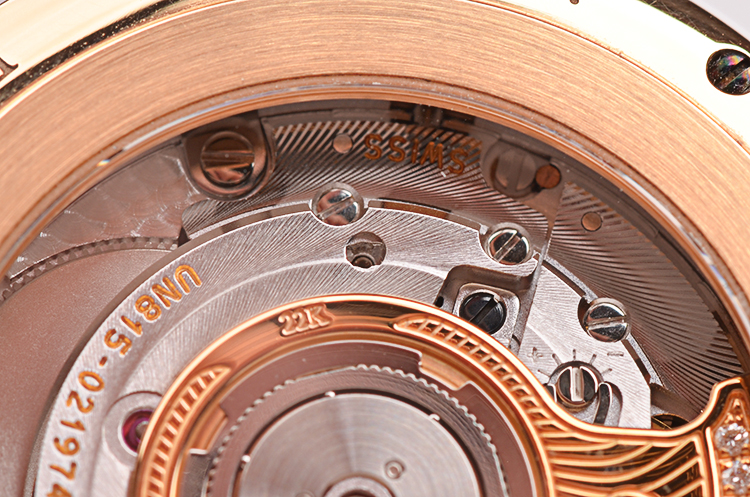 UN自产的CAL.UN-815型机芯,自动机械,极其精致日内瓦条纹打磨,倒角抛光修饰,25钻,摆频28800,22K黄金镶钻镌刻自动转陀,动力储存约42小时,走时状态极嘉。