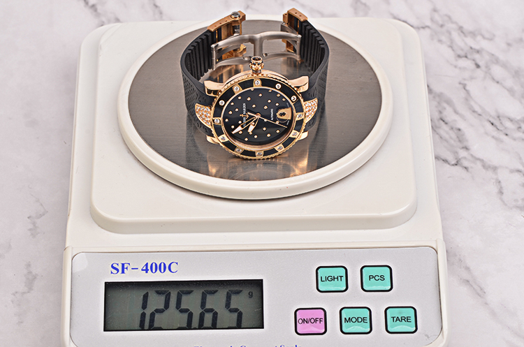 18K玫瑰金表壳,18K玫瑰金及钛合金按压式双向折叠表扣。圣伯纳狗头印记。原厂黑色波浪纹橡胶表带成色极新,表带与表壳两头连接处共计28颗hao华天然美钻。蓝宝石水晶镜面及底盖,18K玫瑰金内嵌陶瓷镶钻时标固定表圈,立体黑色象征繁星夜镶钻(27颗)表盘,玫瑰金镂空夜光时分针,6点位放大镜日历。玫瑰金皇冠式样旋入式防水锁把,口径40MM*11MM,防水100M。
