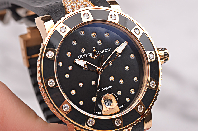 繁星夜美人鱼潜水腕表系列 玫瑰金镶钻大三针日历折叠扣胶带女表