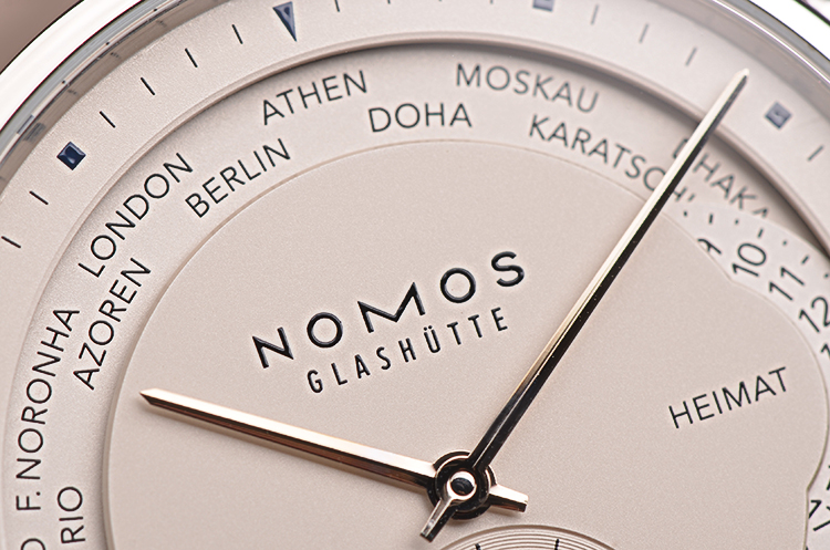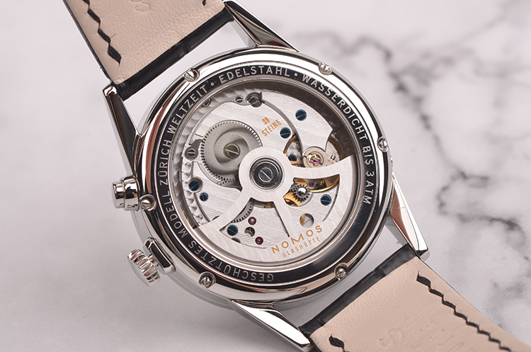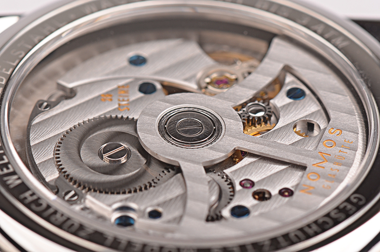 Nomos自产CAL.DUW 5201型机芯,自动机械,精致日内瓦条纹打磨,26钻,摆频21600,动力储存约42小时,走时状态极嘉。