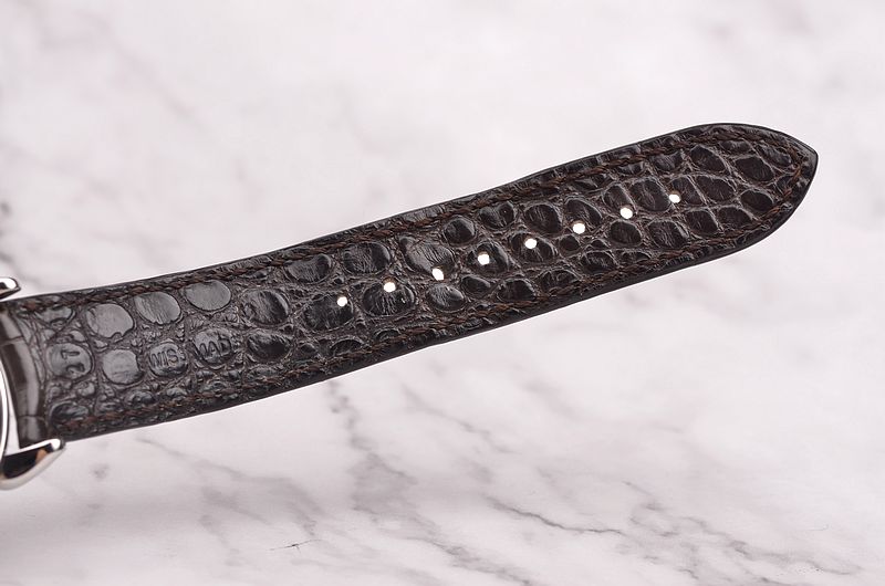 精钢表壳及表扣,原厂深棕色鳄鱼皮表带成色很新。蓝宝石水晶镜面及底盖,立体浅香槟色三重日历表盘,阿拉伯数字刻度,蓝钢时分秒针,星期,日历,月份显示功能。口径40MM*10.35MM,防水30M。