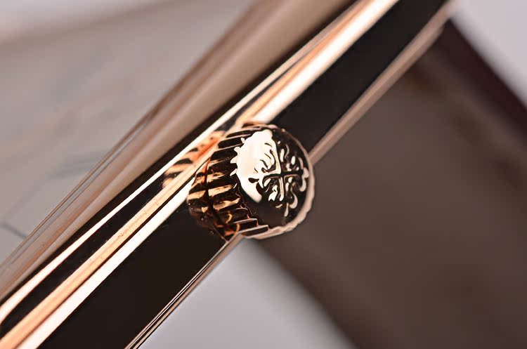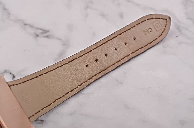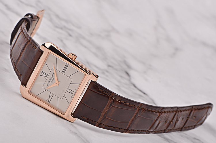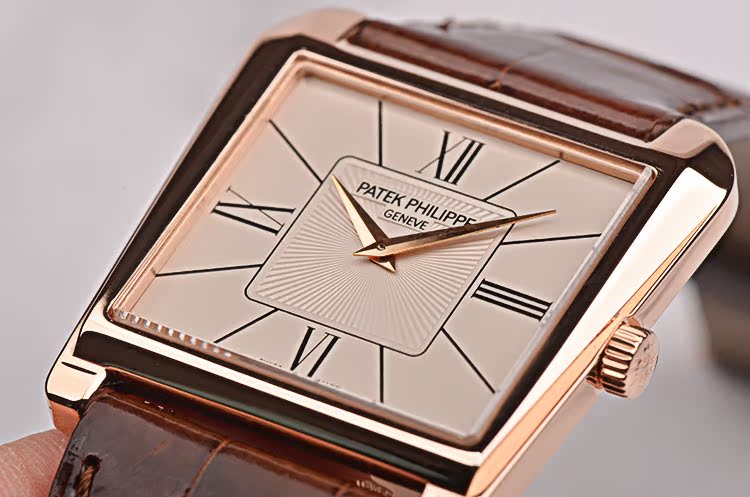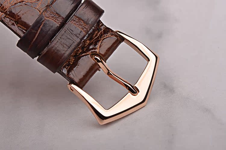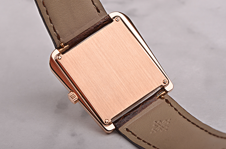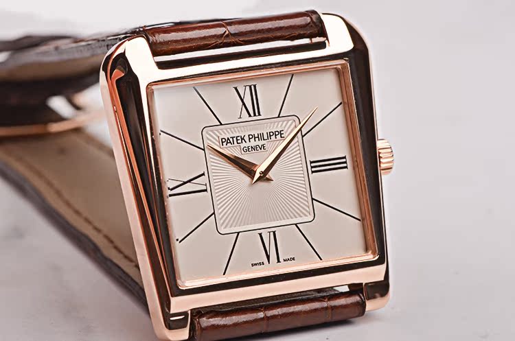 18K玫瑰金倒梯型表壳及表扣,圣伯纳狗头印记。原厂棕色鳄鱼皮表带成色极新。蓝宝石水晶镜面,立体银白色表盘,罗马字时标,玫瑰金指针,口径34MM*32.4MM*6MM,相当于圆表34MM左右大小,男女合用。防水25M。