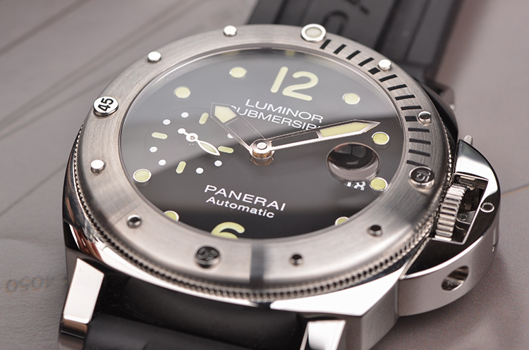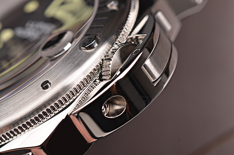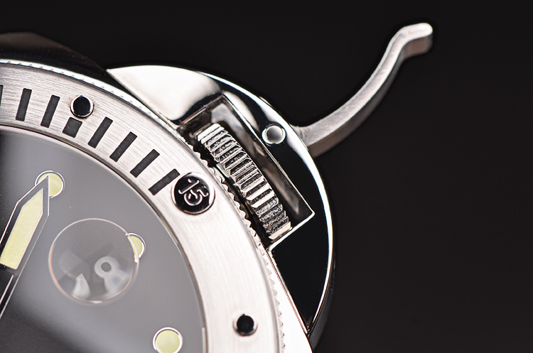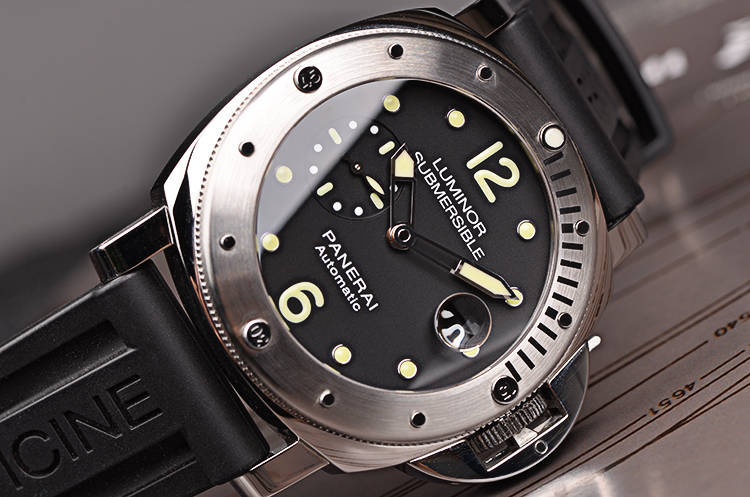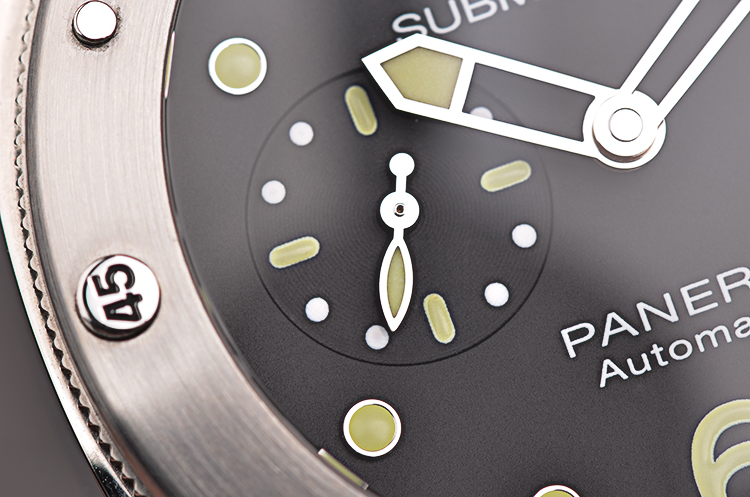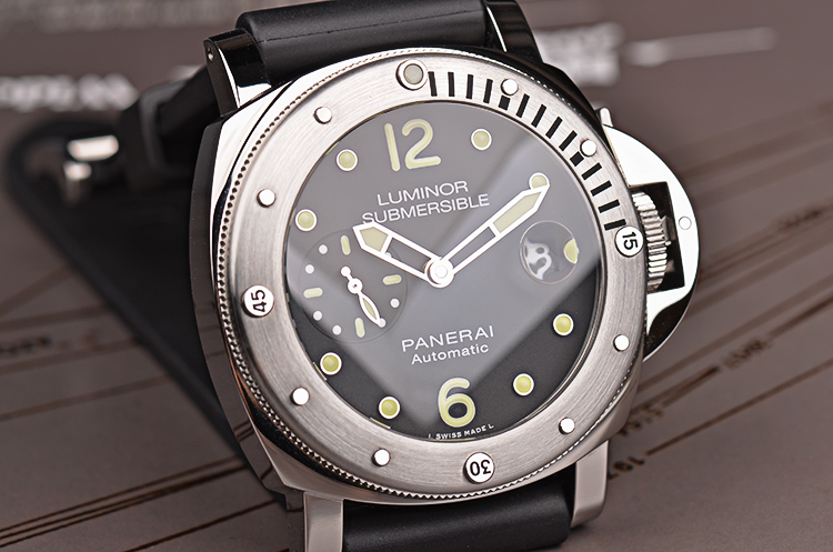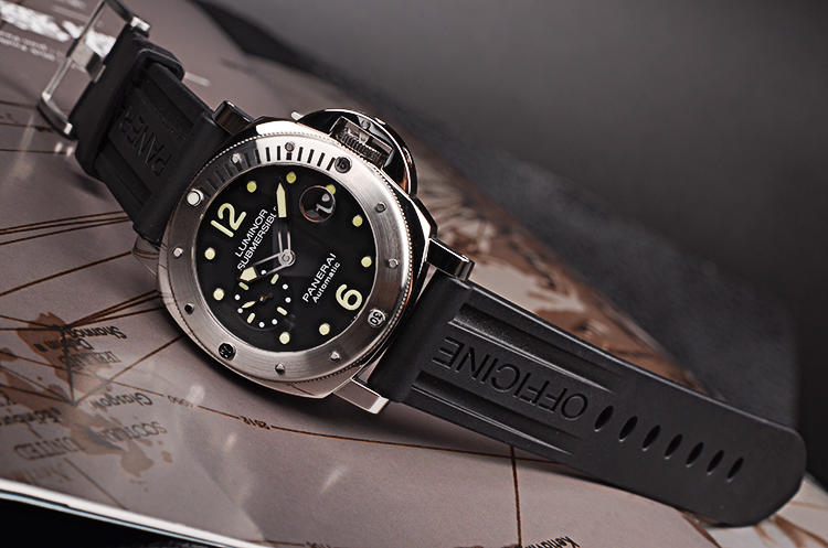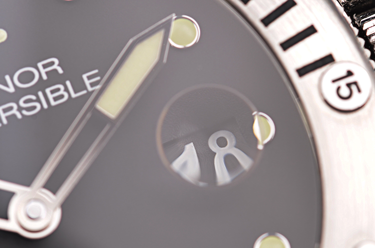 精钢表壳及表扣,全新原厂黑色橡胶表带,另有一条全新黑色尼龙魔术贴表带(共计2条全新原装表带)。蓝宝石水晶镜面,逆时针旋转表框附分度标以计算下潜时间,以及以一分钟为间隔时间的棘轮止逆装置。立体黑色表盘,夜光刻度及指针,9点位独立小秒针,3点位放大镜日历。表冠护桥装置,口径44MM*15.6MM。防水300M。