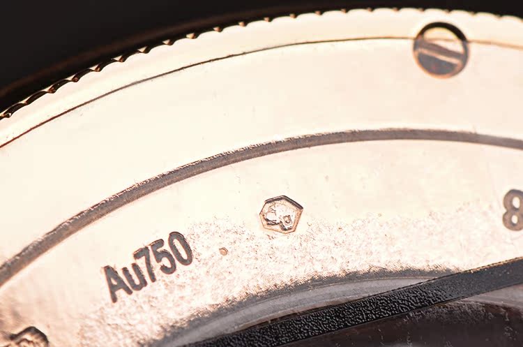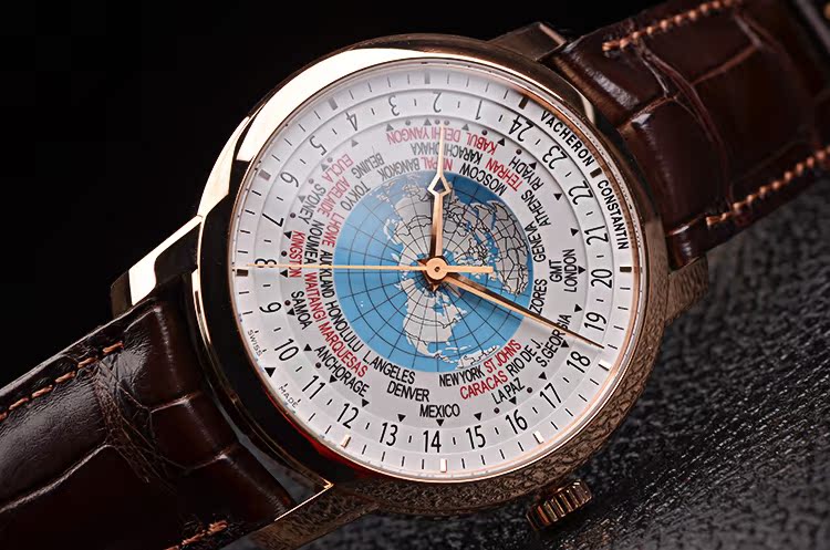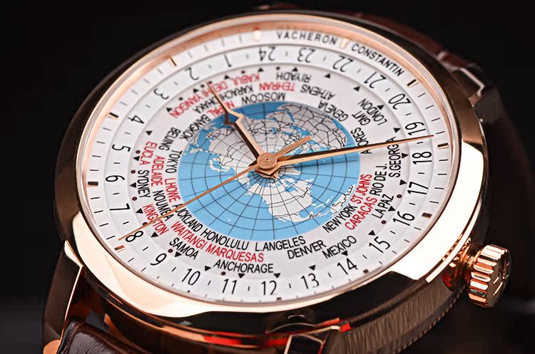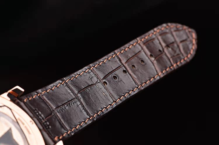 18K玫瑰金表壳及折叠式表扣,圣伯纳狗头印记。全新原装棕色鳄鱼皮表带。蓝宝石水晶镜面及底盖,立体多层表盘,世界时间,南北半球昼夜显示功能。玫瑰金指针,口径42.5MM*11.62MM。防水30M。