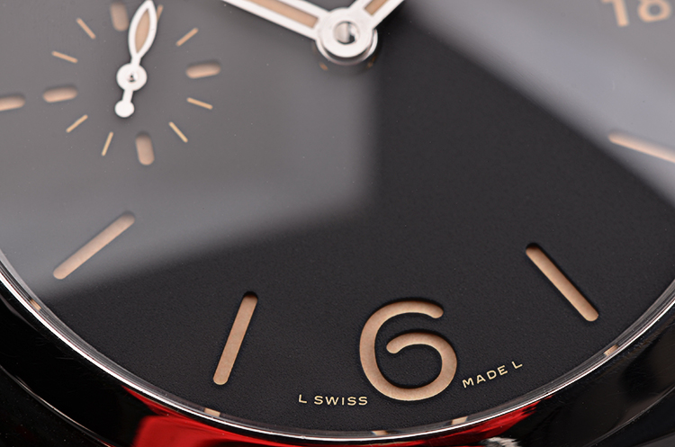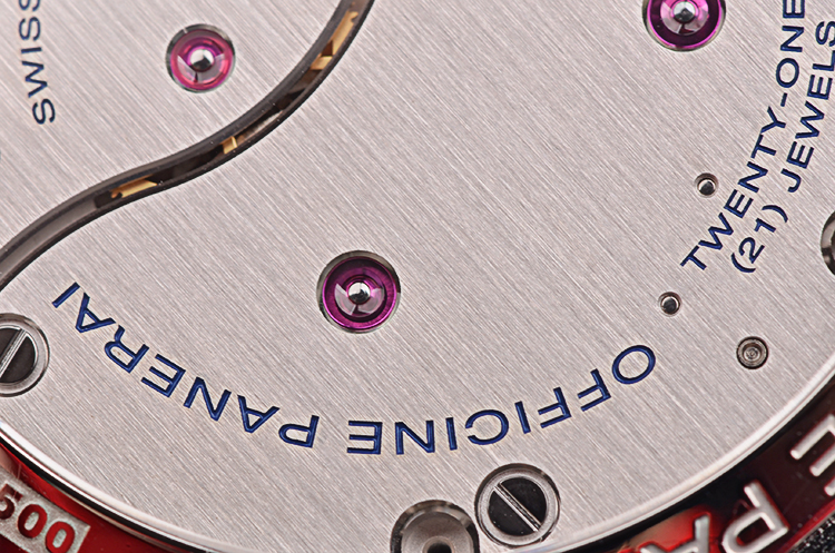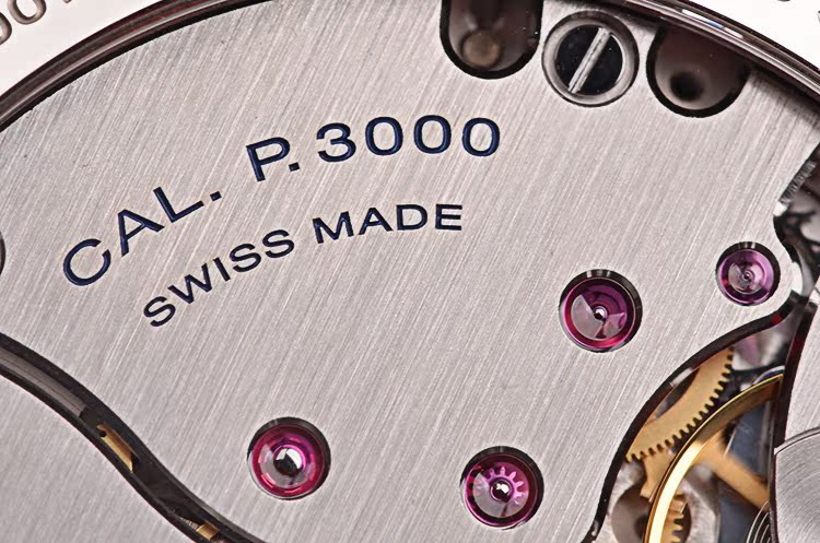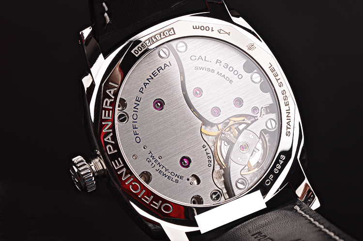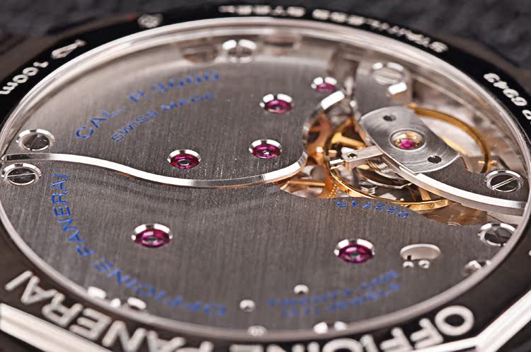 沛纳海自产CAL.P.3000型机芯,手上链,精致日内瓦条纹打磨,倒角抛光修饰。由162个零件组成,21钻,摆频21600,动力储存约72小时(3天链),走时状态极嘉。