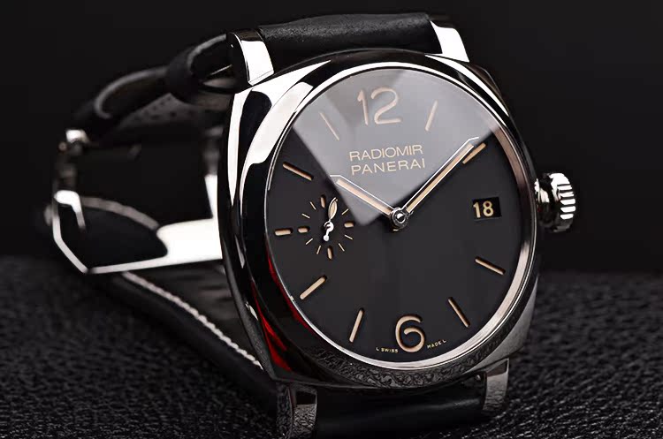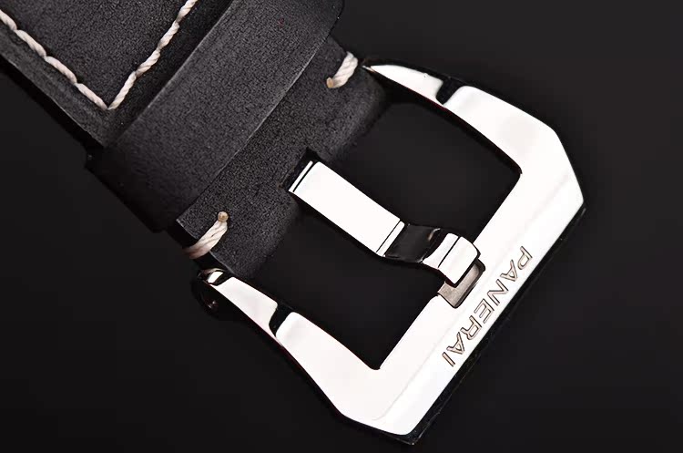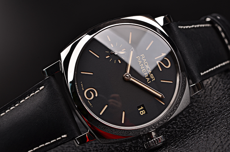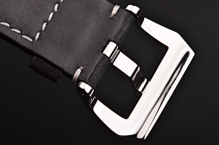 精钢表壳及表扣,后配全新黑色牛皮表带。蓝宝石水晶镜面及底盖,立体黑色三明治表盘,夜光刻度及指针,9点位独立小秒针,3点位日历窗口。旋入式防水表冠,口径47MM*13.75MM。防水100M。