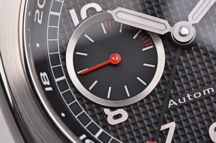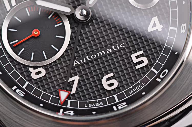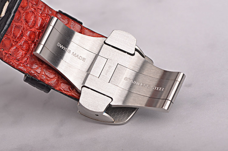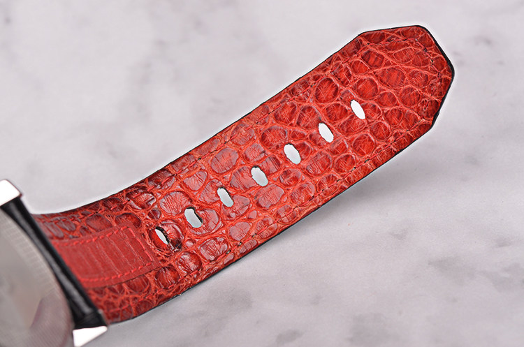 精钢表壳及按压式折叠表扣,全新原装外黑内红鳄鱼皮表带。蓝宝石水晶镜面,立体黑色华夫格表盘,阿拉伯数字刻度,夜光指针,3点位日历窗口,9点位独立小秒针。旋入式防水表把。口径45MM*16.4MM。防水100M。