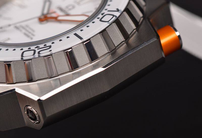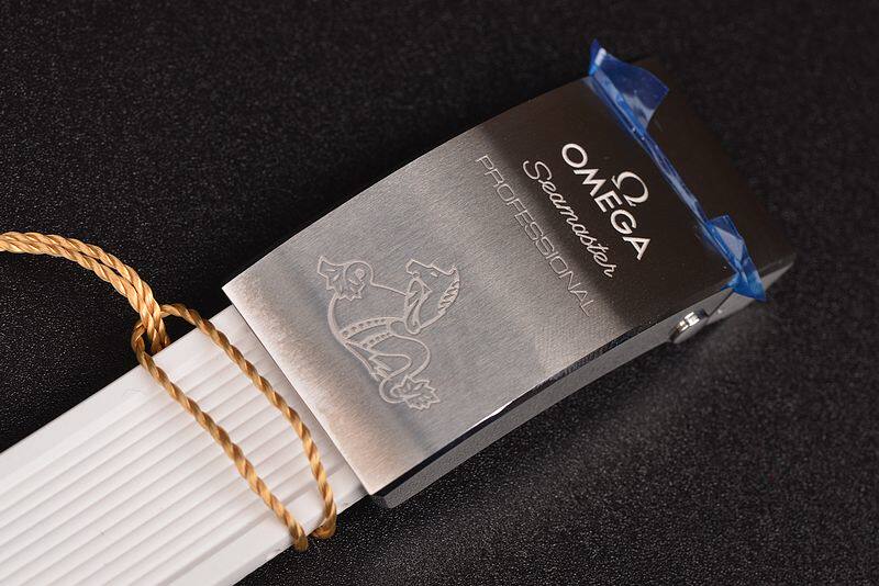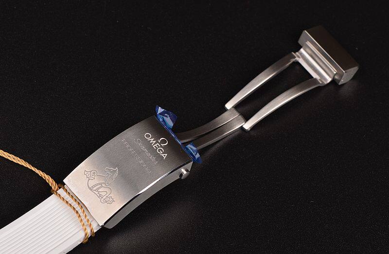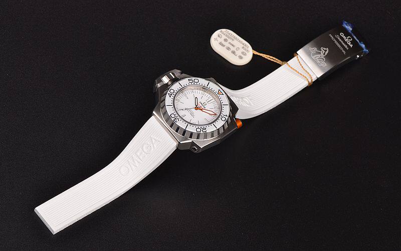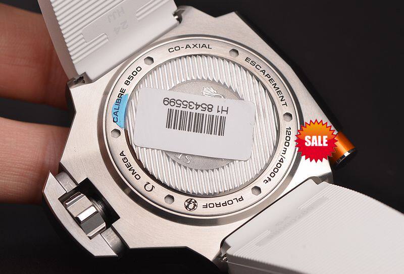 精钢表壳及折叠式表扣,全新原装白色橡胶表带。蓝宝石水晶镜面,带锁止装置的白色双向旋转计时表圈。排氦气阀门装置。立体白色表盘,夜光刻度及指针,4至5点位间日历显示。带护桥的旋入式防水表冠。海马雕刻底盖。口径55MM*48MM*16MM,相当于圆表50MM左右大小。防水深达1200M。