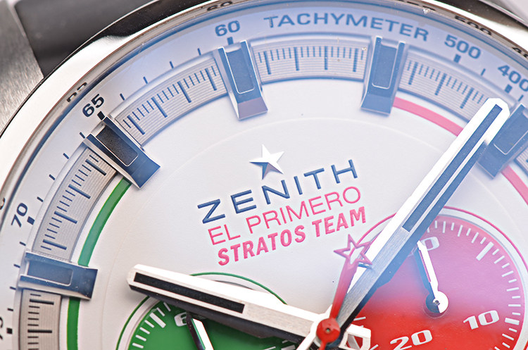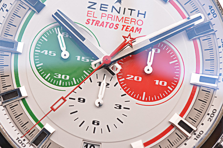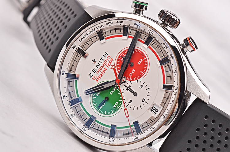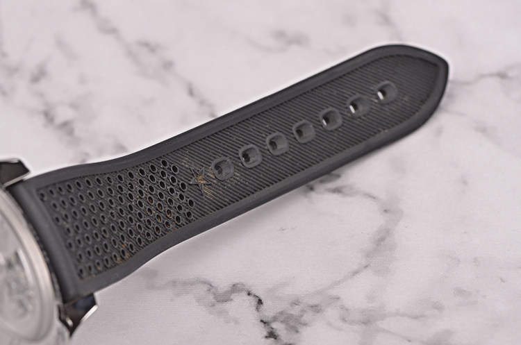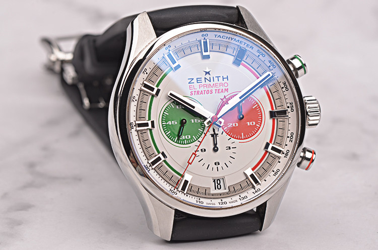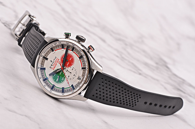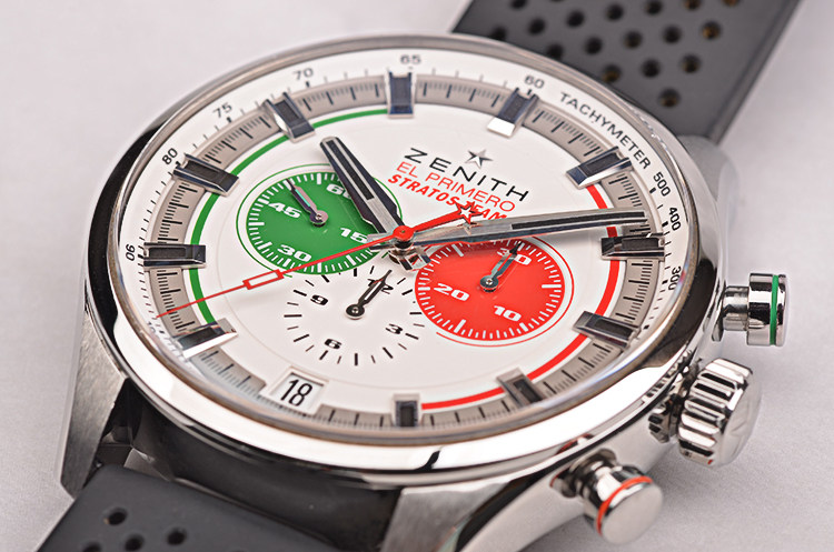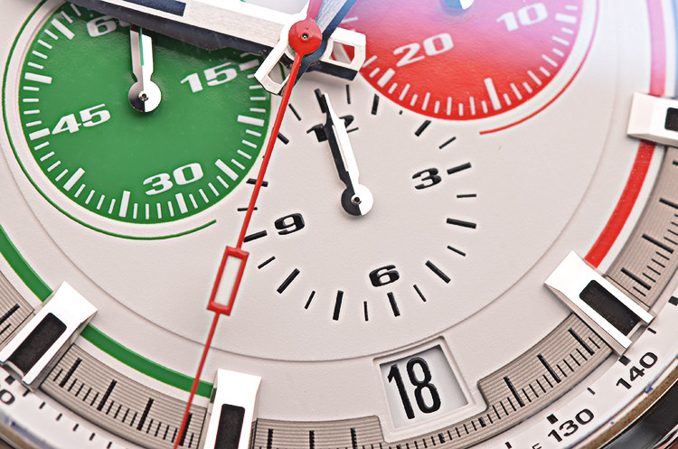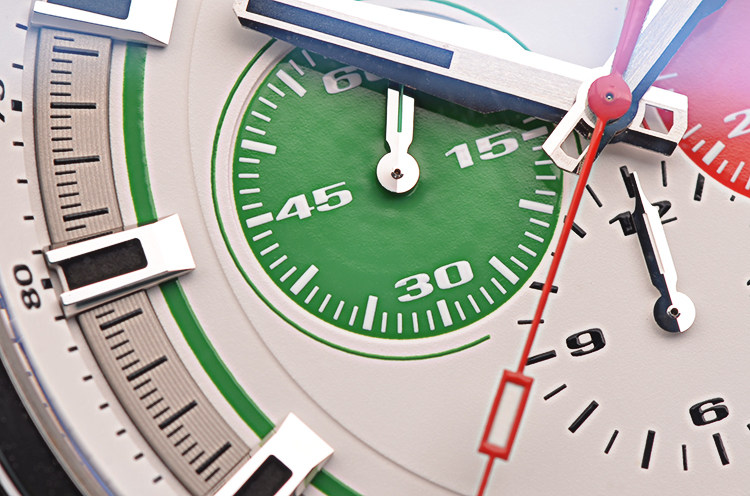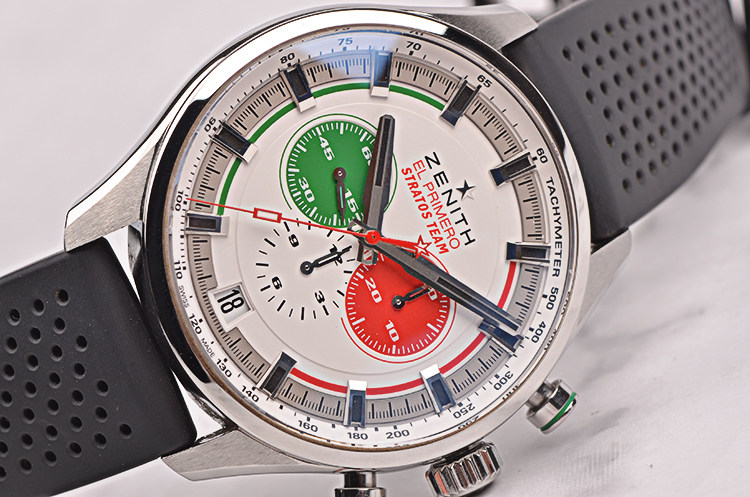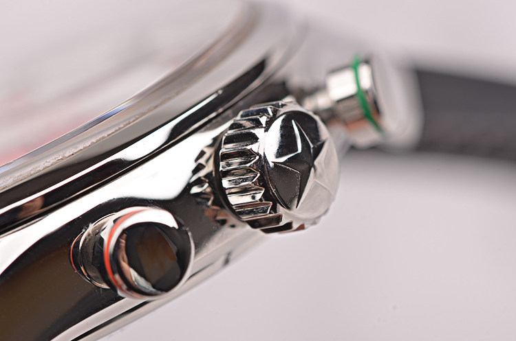 精钢表壳及按压式双向折叠表扣,原厂黑色橡胶表带成色极新。蓝宝石水晶镜面及底盖,立体白色表盘搭配红绿双色计时圈,测速内表圈,夜光刻度及时分针,9点位独立小秒针,6点位12小时计时圈,3点位30分钟计时圈,6点位日历显示窗口。口径45MM*14.05MM。防水100M。
