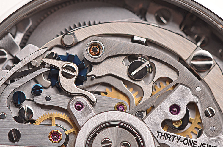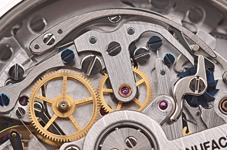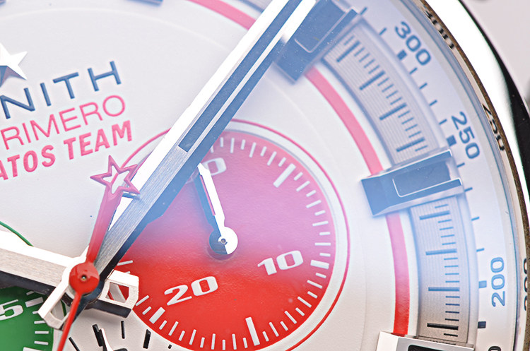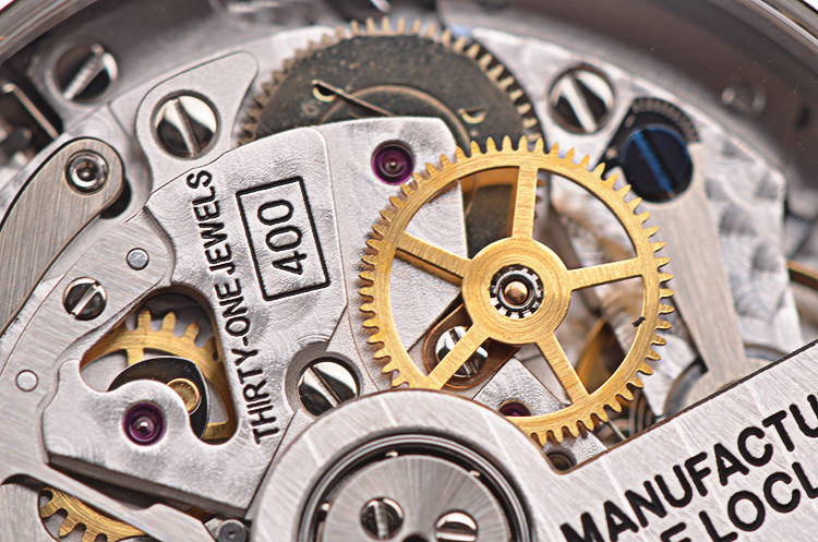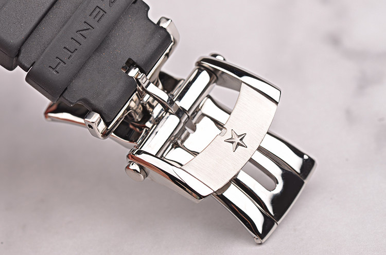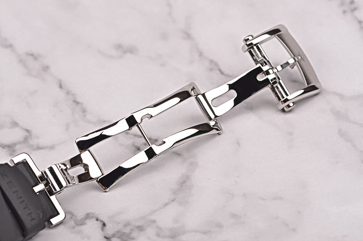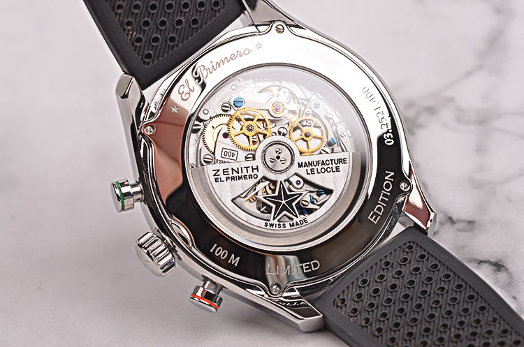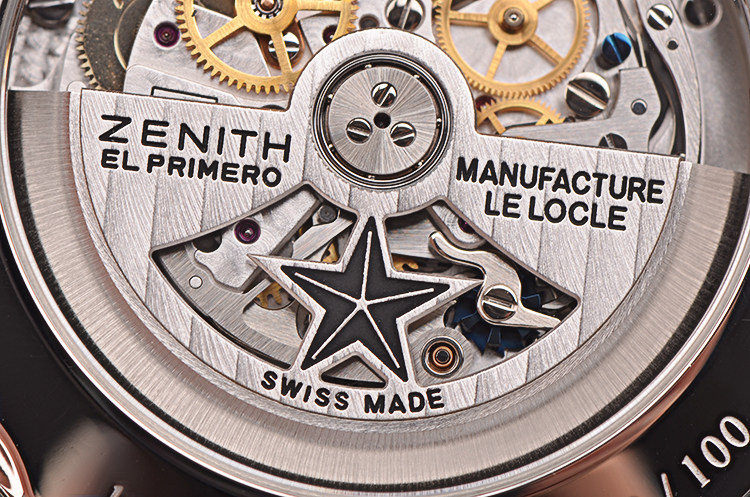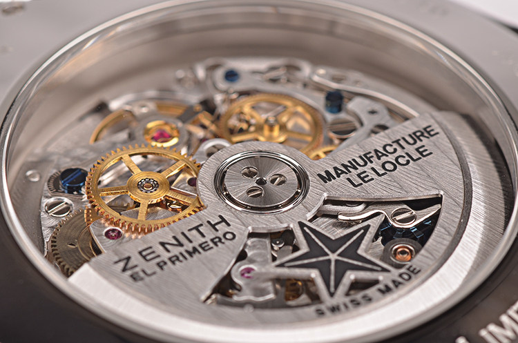 真力时自产的 El Primero Caliber 400 B型机芯,自动机械,精致日内瓦条纹打磨。由326个零件组成,KIF避震器,31钻,摆频36000,高频计时码表,动力储备约50小时。走时状态极嘉。