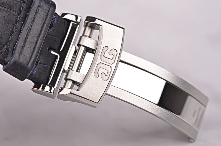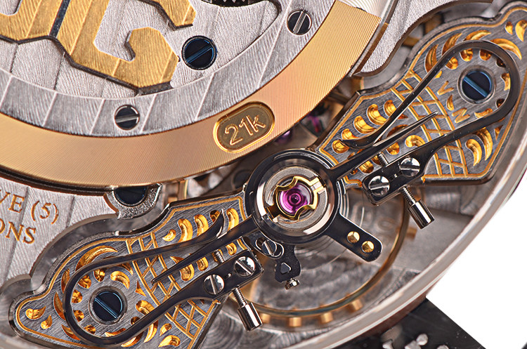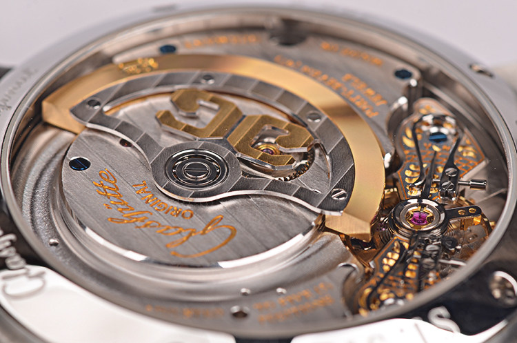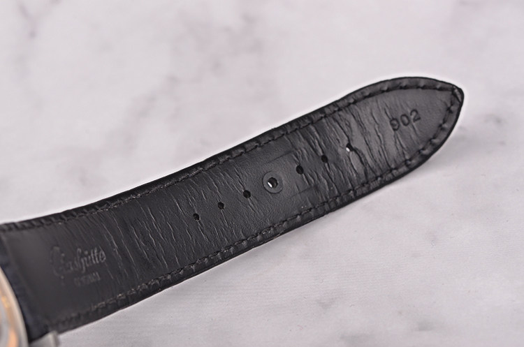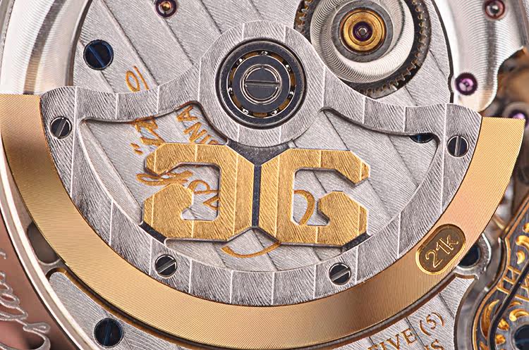 GO自产的CAL.90-02型机芯,自动机械,极其精致人手条纹打磨,倒角抛光修饰,德式3/4大甲板机芯,双鹅颈微调,精美人手雕花摆轮夹板,21K金边镂空自动陀配重,47钻,摆频28800,5方位校正,机芯有独立签署。动力储存约42小时。走时状态极嘉。