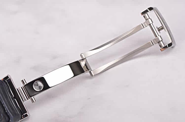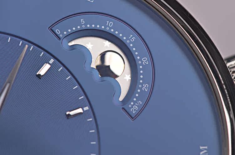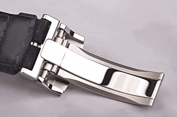 精钢表壳及折叠式表扣,原厂黑色路易斯安娜短吻鳄鱼皮表带成色很新。蓝宝石水晶镜面及底盖,立体蓝色偏心表盘,夜光时分针,大日历,月相功能,表壳侧面2点位月相调校孔。口径40MM*12.7MM。防水50M。