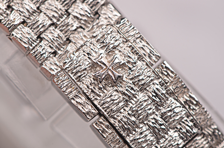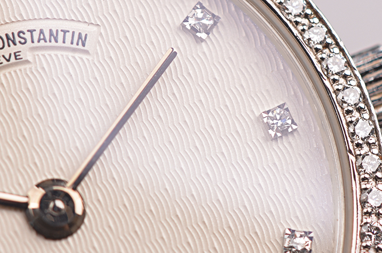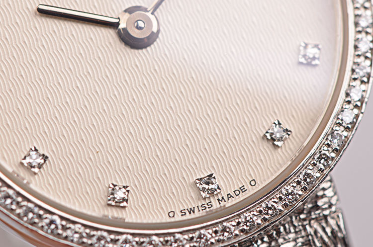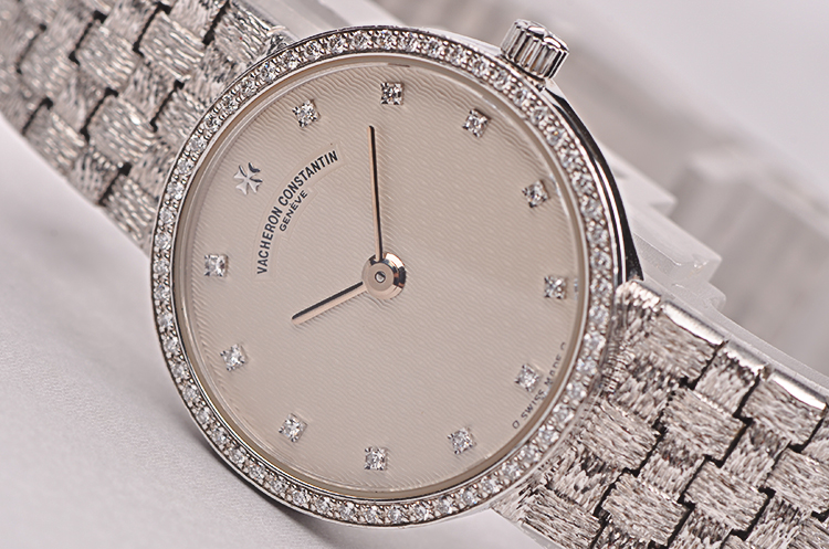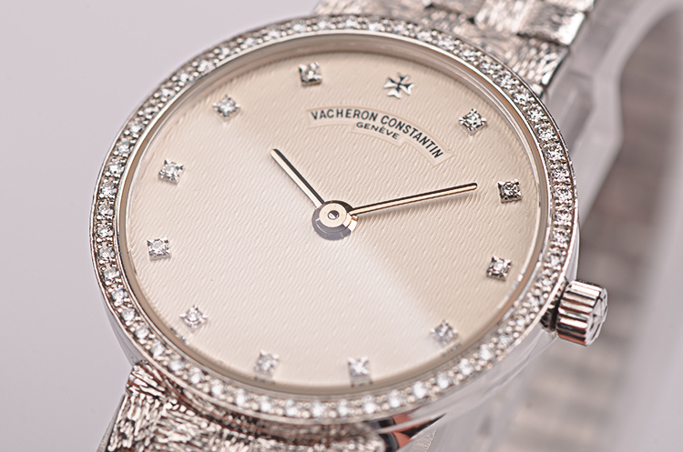 18K白金表壳及编织链带,折叠表扣,圣伯纳狗头印记。蓝宝石水晶镜面,立体银白色波浪纹表盘,表圈及刻度原厂镶嵌hao华天然美钻,白金指针。口径23.5MM*5.7MM,超薄女表,防水30M。