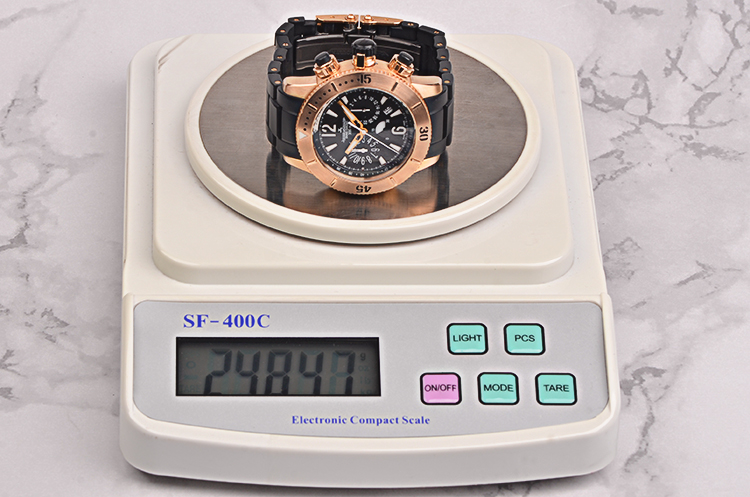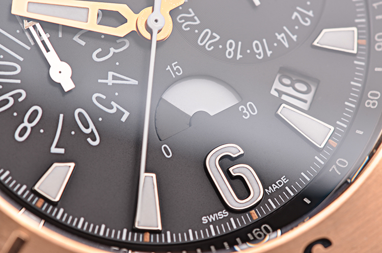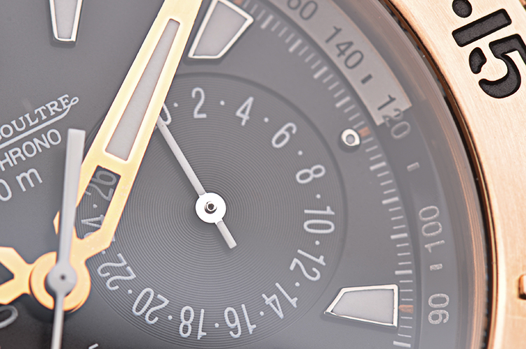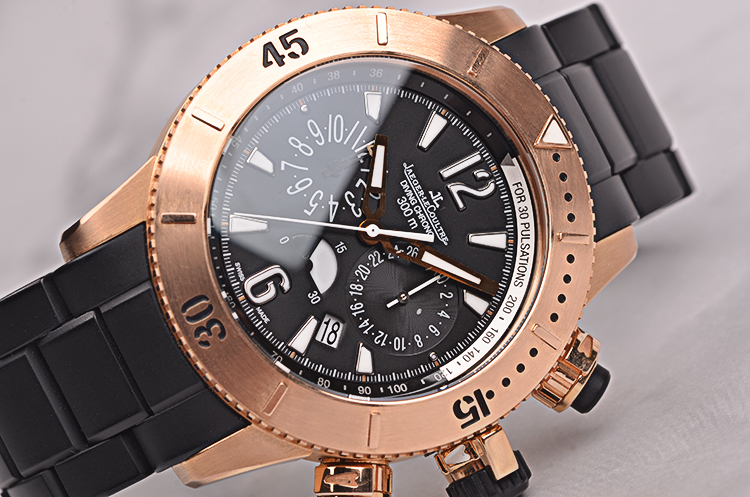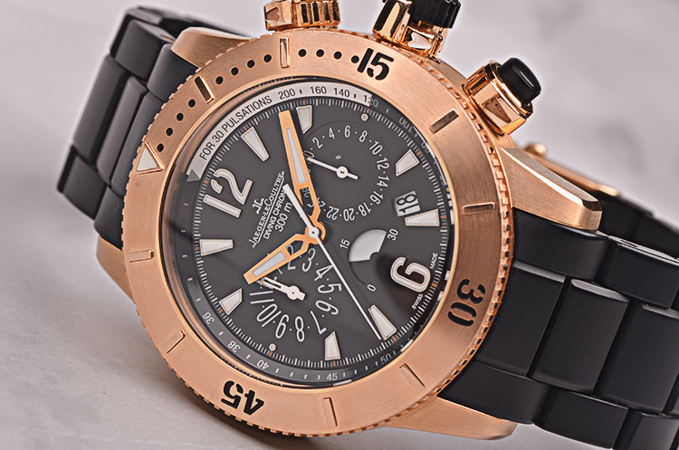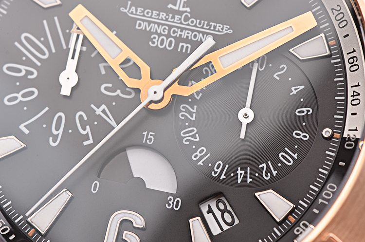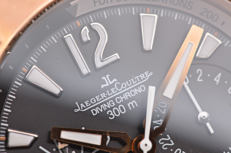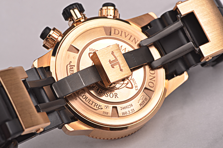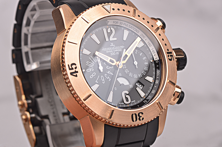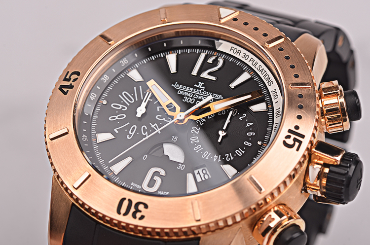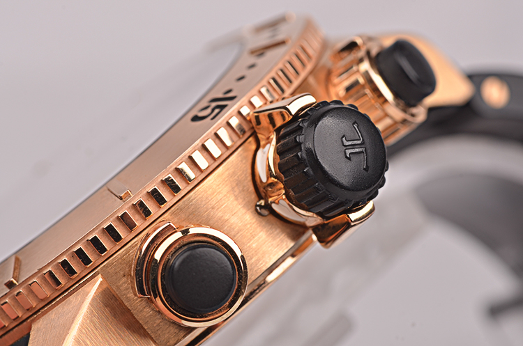 18K玫瑰金表壳,原装黑色高科技橡胶链带,玫瑰金及黑色pvd精钢折叠式表扣。圣伯纳狗头印记。单向可旋转玫瑰金计时表圈,蓝宝石水晶镜面,立体黑色计时表盘,玫瑰金夜光刻度及时分针,3点位30分钟计时,4至5点位间日历窗口,6点位黑白双色转盘式秒针,9点位12小时计时。表冠锁止装置防止误操作。口径44MM*16.1MM。防水300M。