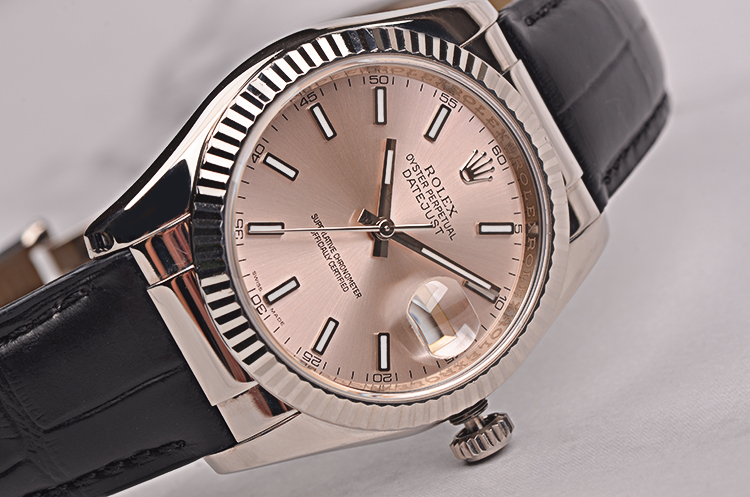 18K白金表壳及折叠式表扣,圣伯纳狗头印记。18K白金三角坑纹表圈。后配全新黑色鳄鱼皮表带。蓝宝石水晶镜面,立体粉色表盘搭配白金夜光条丁刻度,白金夜光时分针,3点位放大镜日历视窗。旋入式防水表冠。口径36MM*12MM。防水100M。