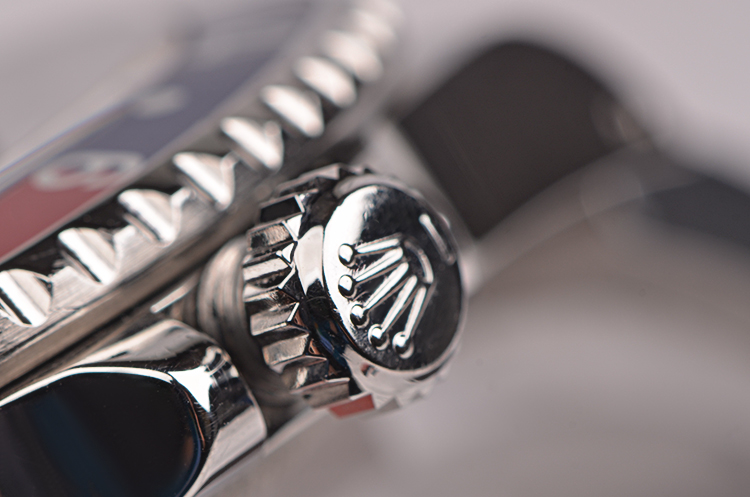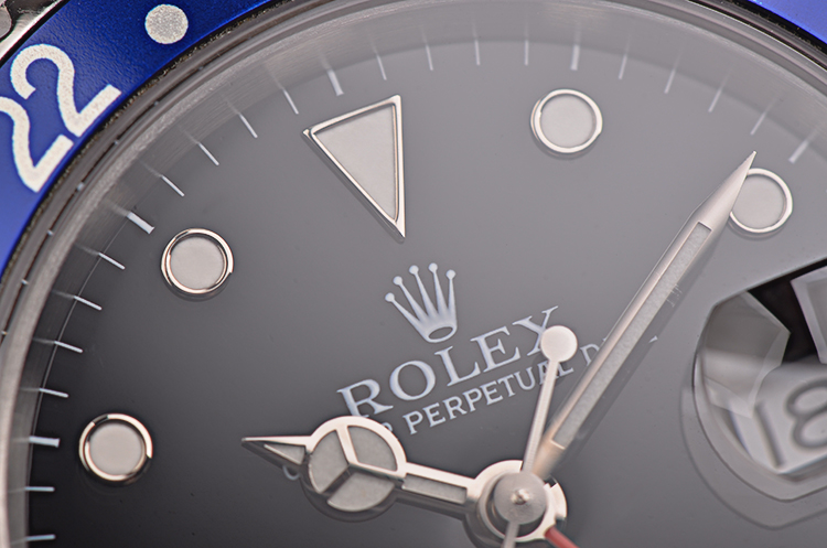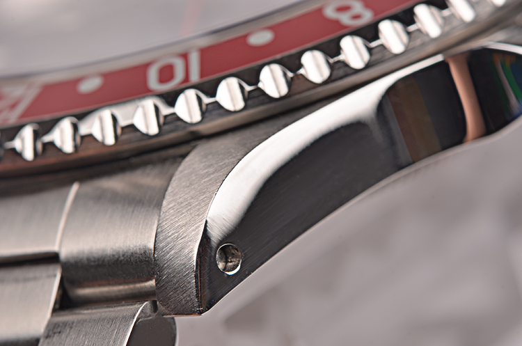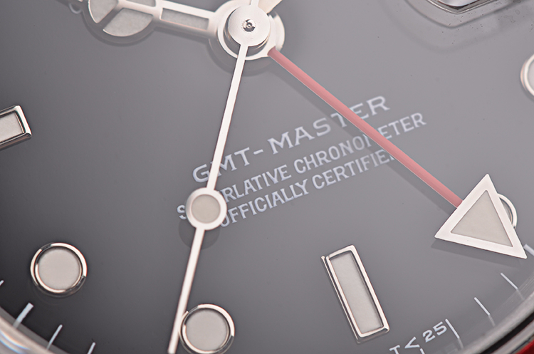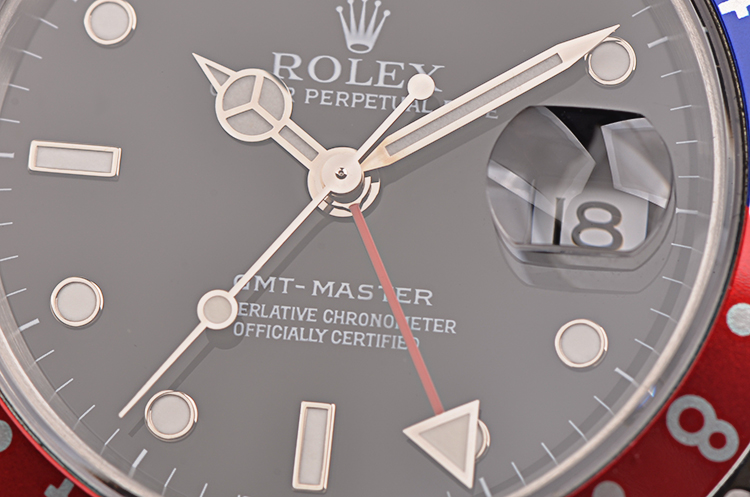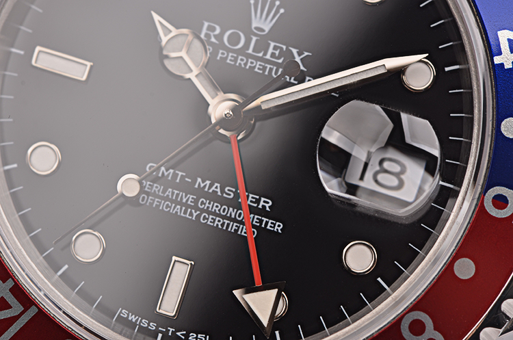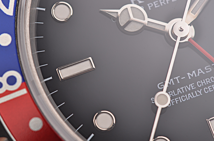 精钢表壳及链带,折叠式表扣。原厂原配GMT红蓝可乐圈,蓝宝石水晶镜面,立体黑色T<25面盘。3点位放大镜日历。旋入式防水表冠。口径40MM*12.8MM,防水100M。