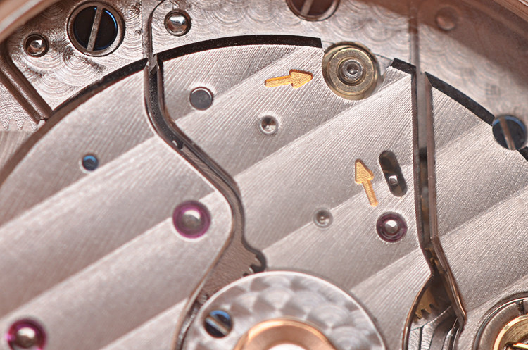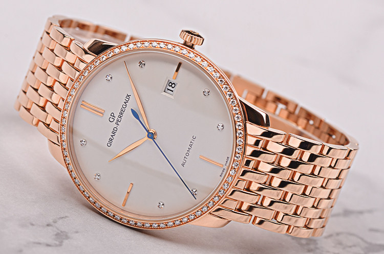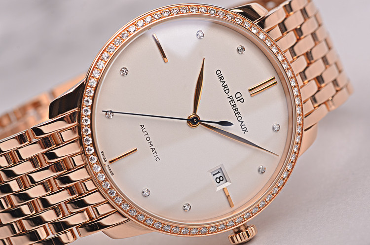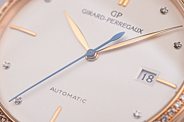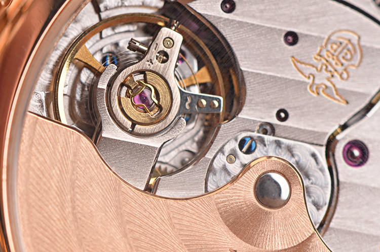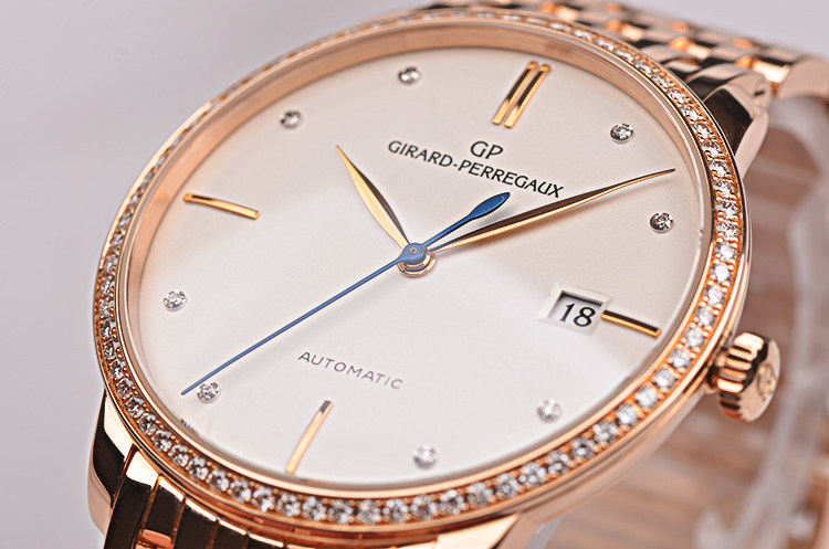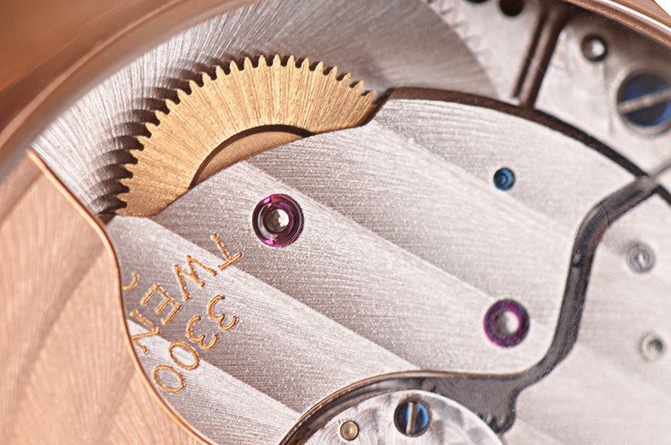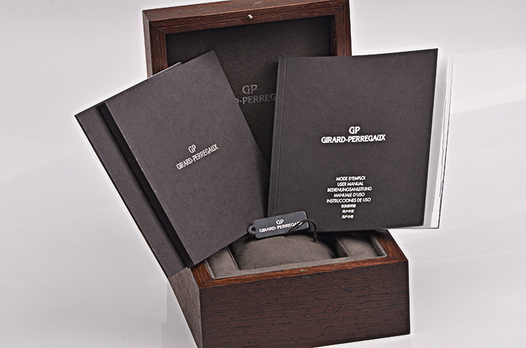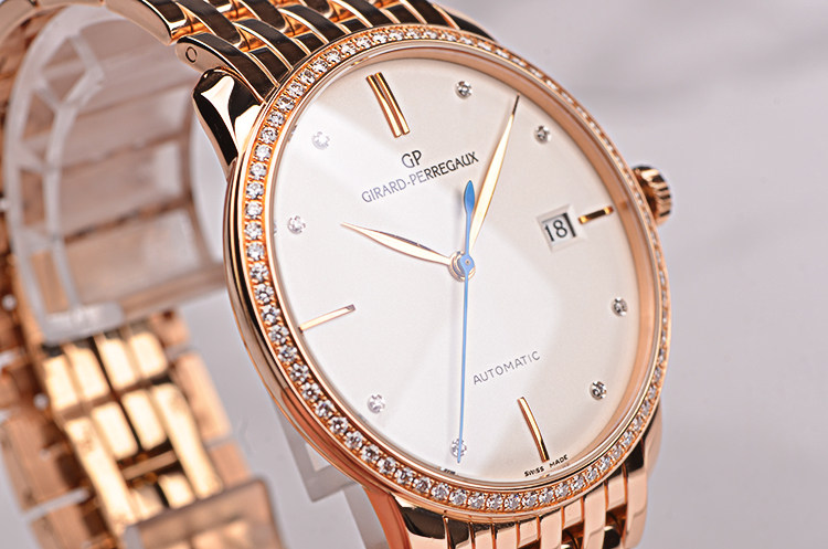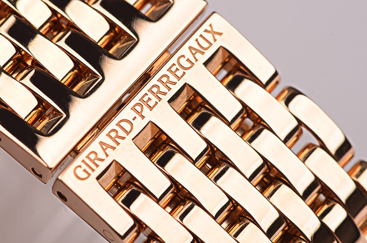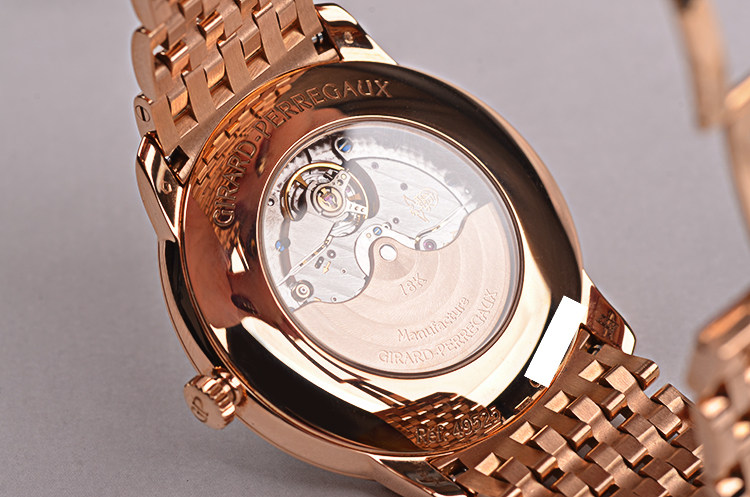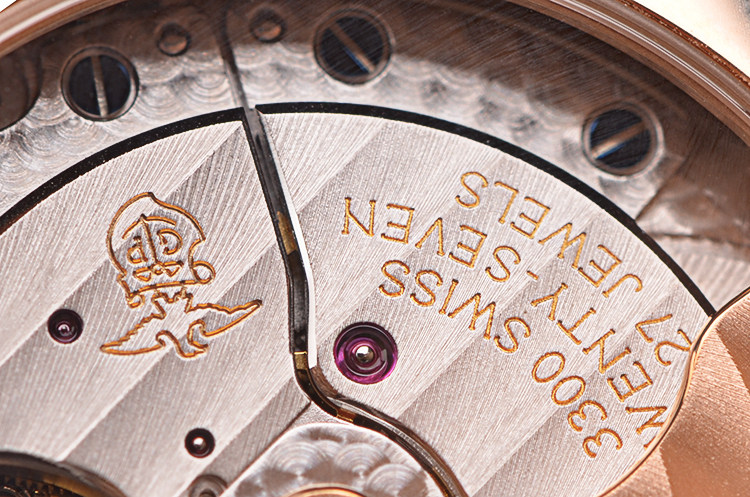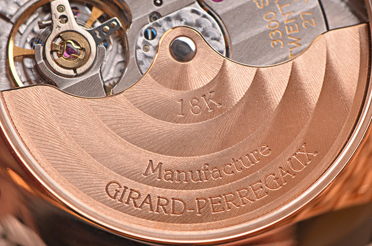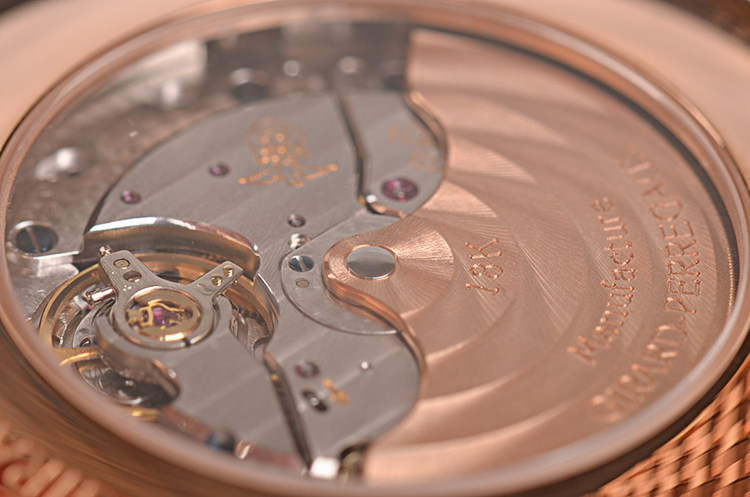 GP自产CAL.GP03300型机芯,自动机械,极其精致日内瓦条纹打磨,倒角抛光修饰。由218个零件组成,27钻,摆频28800,18K玫瑰金镌刻自动转陀,动力储存约46小时,走时状态极嘉。