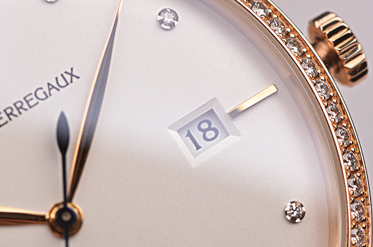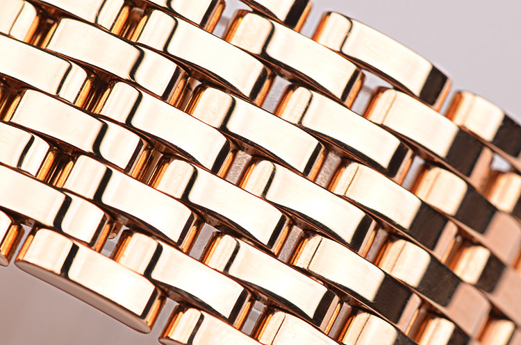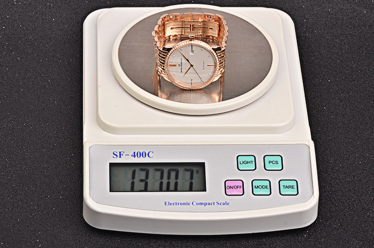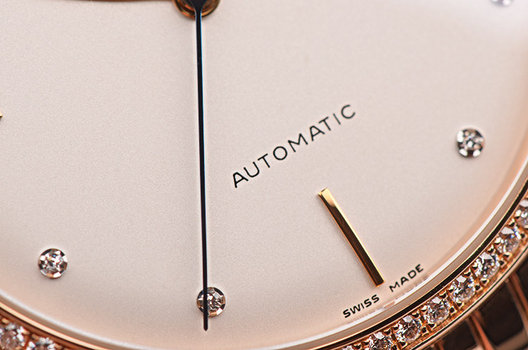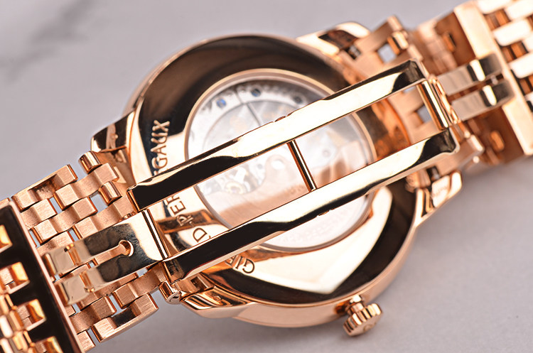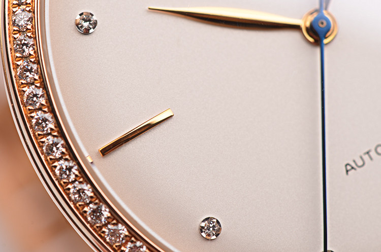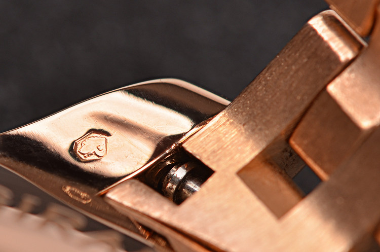 奢华18K玫瑰金表壳及链带,双向折叠表扣,圣伯纳狗头印记。蓝宝石水晶镜面及底盖,表框原厂镶嵌72颗hao华天然美钻(共计约0.85克拉)。立体白色表盘,8颗钻石时标,玫瑰金时分针,蓝钢秒针,3点位日历显示。口径38MM*8.62MM,防水30M。