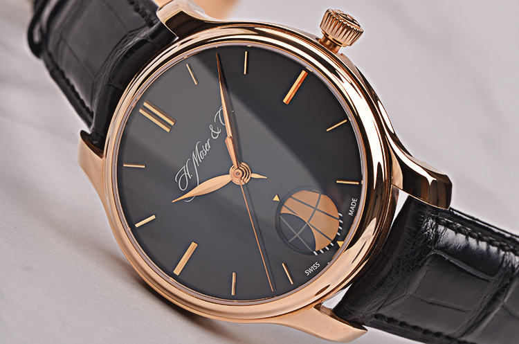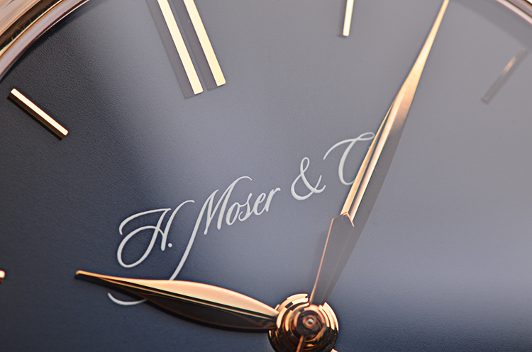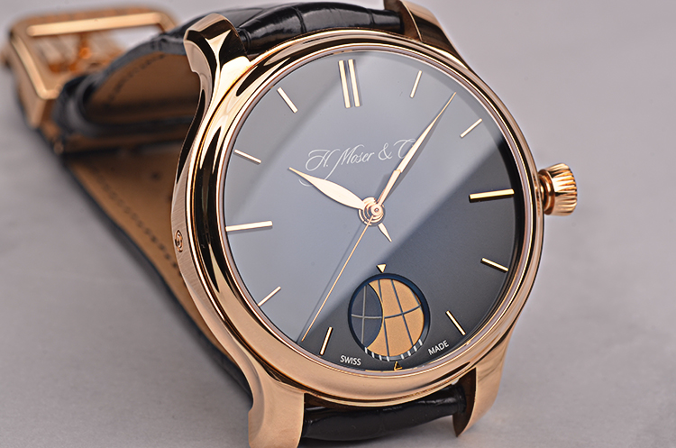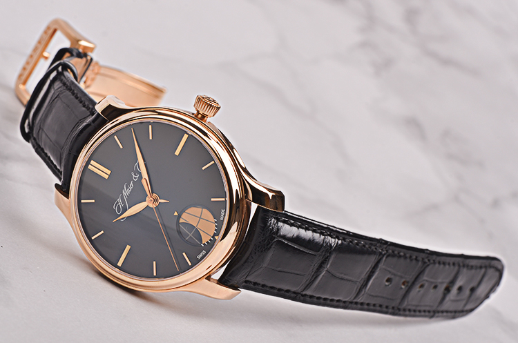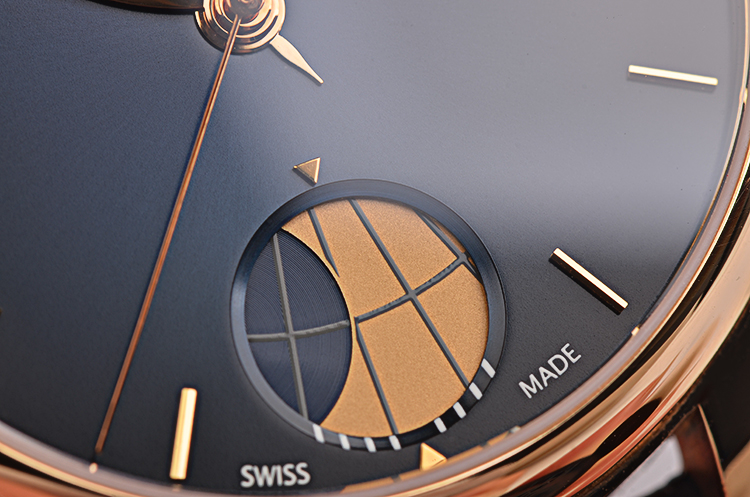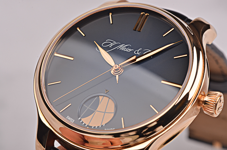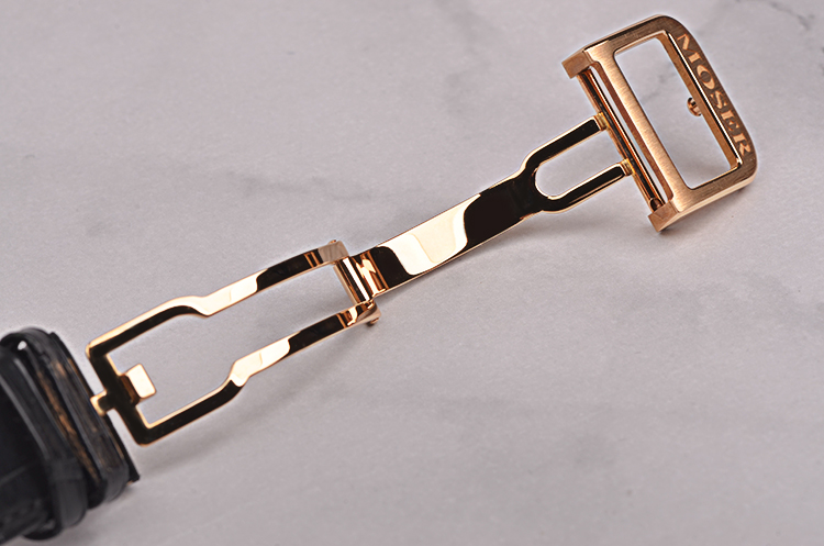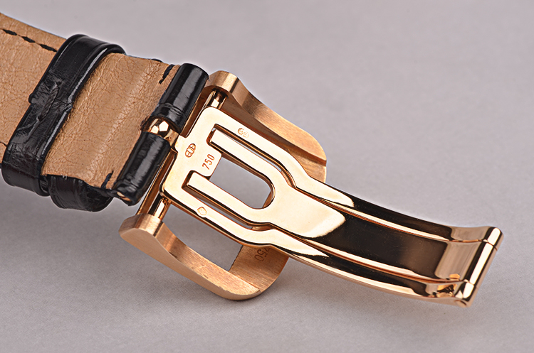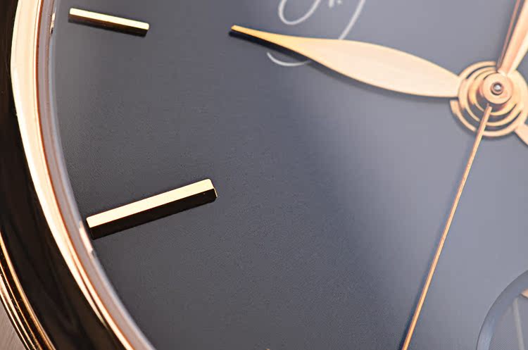 18K玫瑰表壳及折叠式表扣,圣伯纳狗头印记。原厂黑色鳄鱼皮表带成色极新。蓝宝石水晶镜面及底盖,特有的深蓝色fumé烟熏表盘,光影氤氲。玫瑰金刻度及指针。表盘中央短针为上下午指示针,每24小时转动一圈(12至6点钟的时标指示上午,7至11点钟的时标指示下午)。6点位大型永久月相显示窗口,可进行调节且读数精确至分钟。月亮绕着地球公转一周,最后回到其初始位置 (相对于太阳),平均需要29.53059天,也就是29天12小时44分2.9秒。Endeavour Moon腕表精巧新颖的传动轮系可极为精确地转译这一时间段,1,027年后的误差仅为一天,亦被称为“千年月相”。平均每一天的误差仅0.23秒,堪称最精准的月相表!口径40.8MM*11.1MM。防水30M。