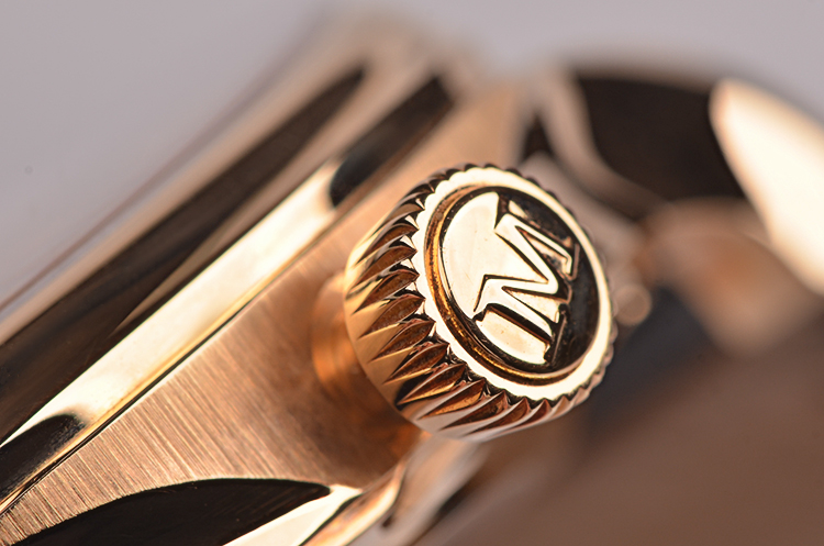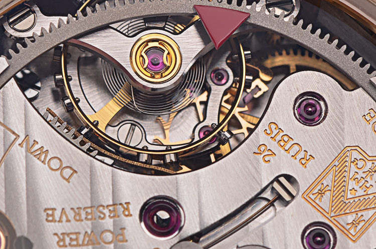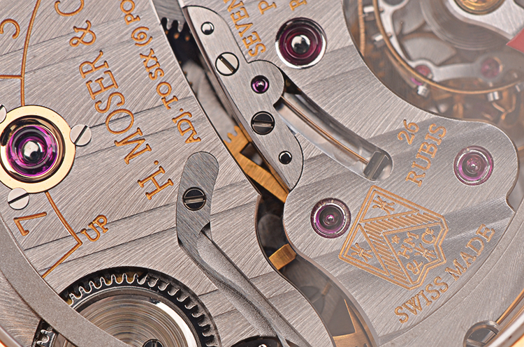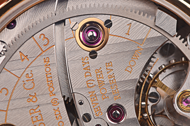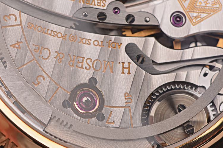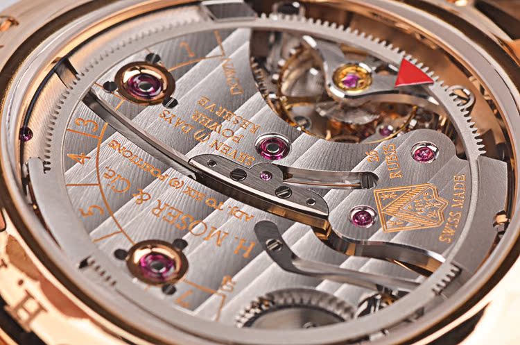 亨利慕时自产的CAL.HMC348型机芯,手动上链,极其精致日内瓦条纹打磨,倒角抛光修饰,专利双层游丝(原装斯特拉曼游丝 (Straumann Hairspring®), 带稳定的宝玑游丝),金质擒纵叉和擒纵轮,金质调节螺钉。26钻,6方位校正,机芯红三角指示1至7天动能储备显示。七天长动力机芯,双发条盒,停秒功能。摆频18000,走时状态极嘉。
