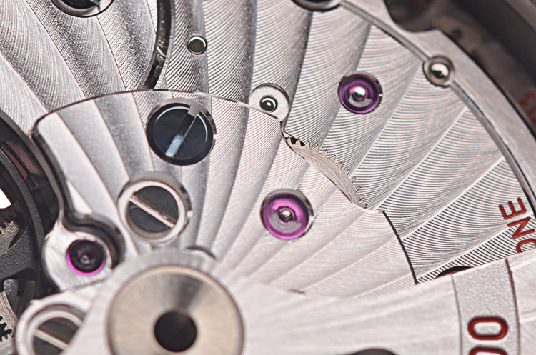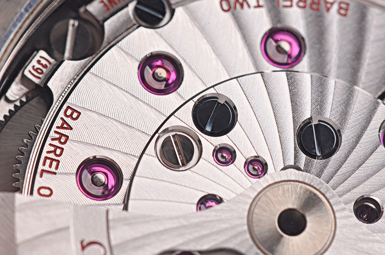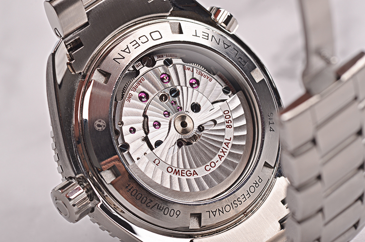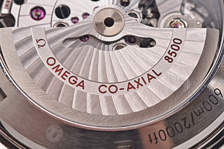 欧米茄自产著名的CAL.8500型机芯,自动上链同轴机芯,配备带有无卡度游丝摆轮和接续排列的双发条盒,双向自动上链系统。夹板和摆铊上饰有独特的阿拉伯风格日内瓦波纹。39钻,摆频25200,瑞士天文台认证,动力储存约60小时。走时状态极嘉。