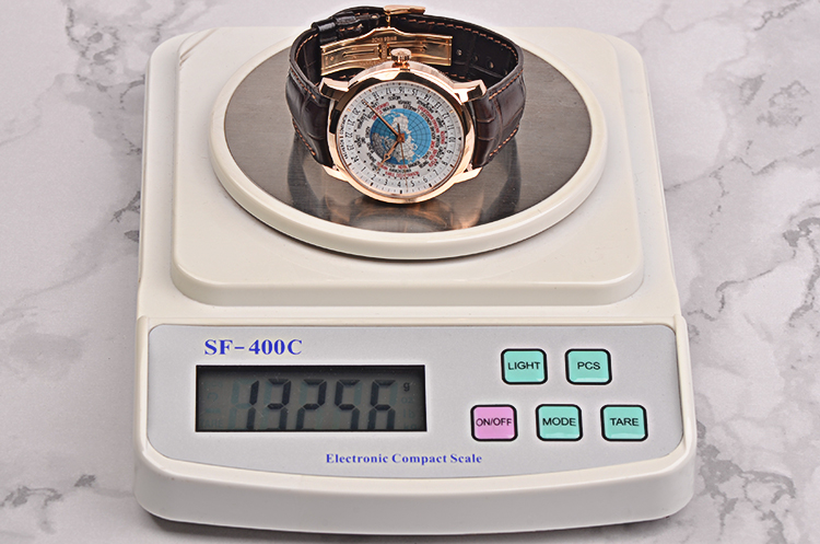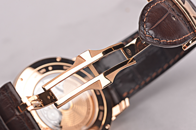 18K玫瑰金表壳及折叠式表扣,圣伯纳狗头印记。原厂棕色鳄鱼皮表带成色极新。蓝宝石水晶镜面及底盖,立体多层表盘,世界时间,南北半球昼夜显示功能。玫瑰金指针,口径42.5MM*11.62MM。防水30M。
