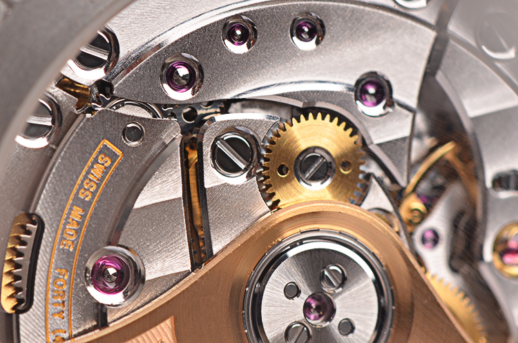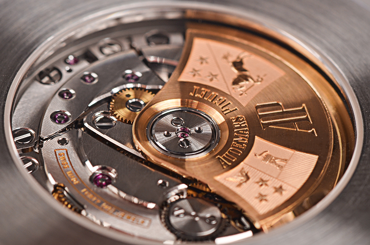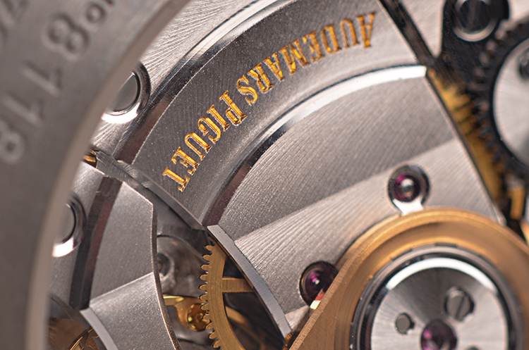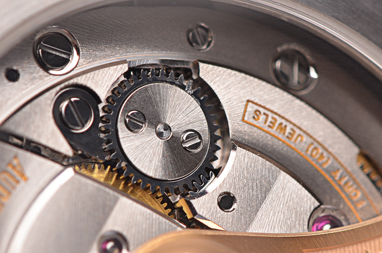 AP自产的CAL.3120型机芯,自动机械,由280个零件组成,极其精致日内瓦条纹打磨,倒角抛光修饰,陶瓷滚珠轴承中央自动盘,40钻,摆频21600,KIF避震器,22K黄金镌刻自动摆陀,动力储存约60小时,走时状态极嘉。