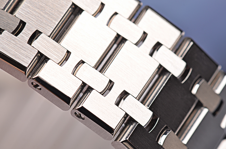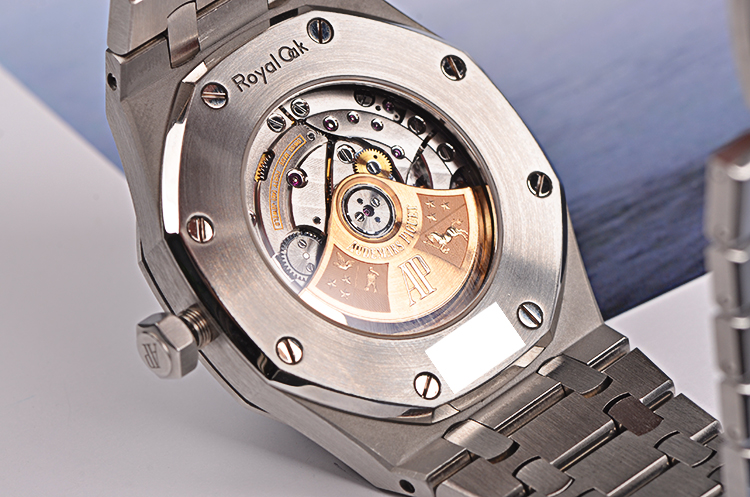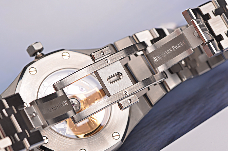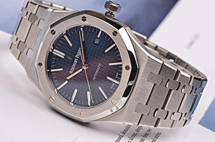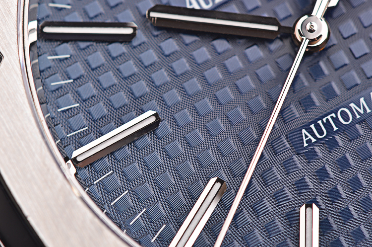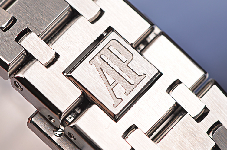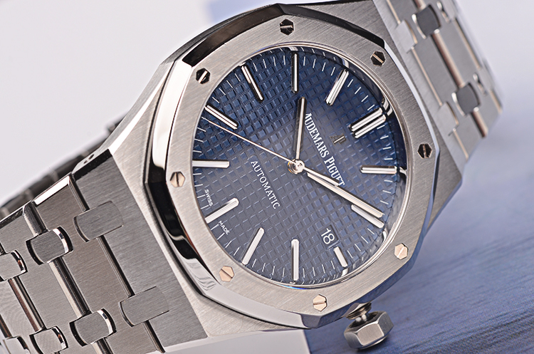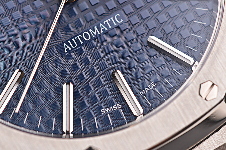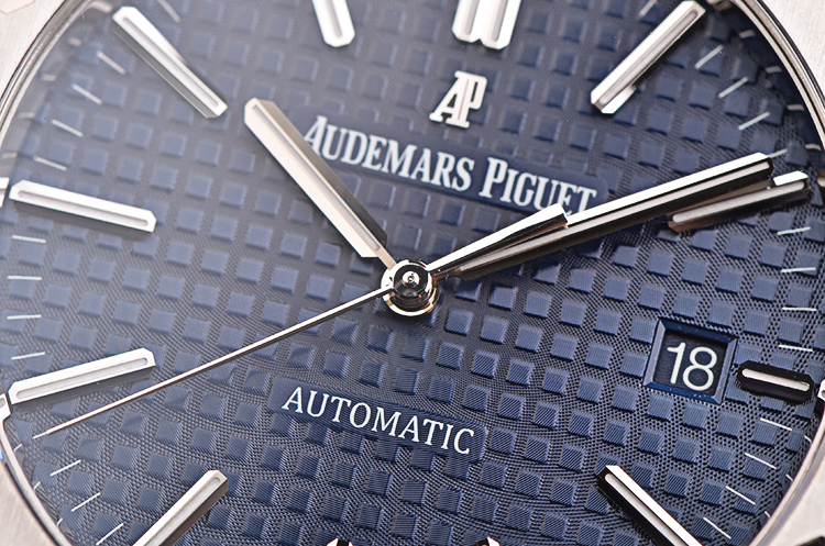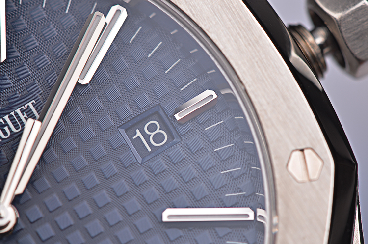 精钢八角皇家橡树表壳及链带,双向按压式折叠式表扣。前后盖白金螺丝,蓝宝石水晶镜面及底盖,热门的立体蓝色华夫格表盘,大三针设计。白金夜光刻度及指针,3点位日历显示。口径41MM*9.8MM。旋入式防水表冠。防水50M。