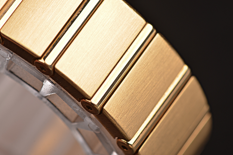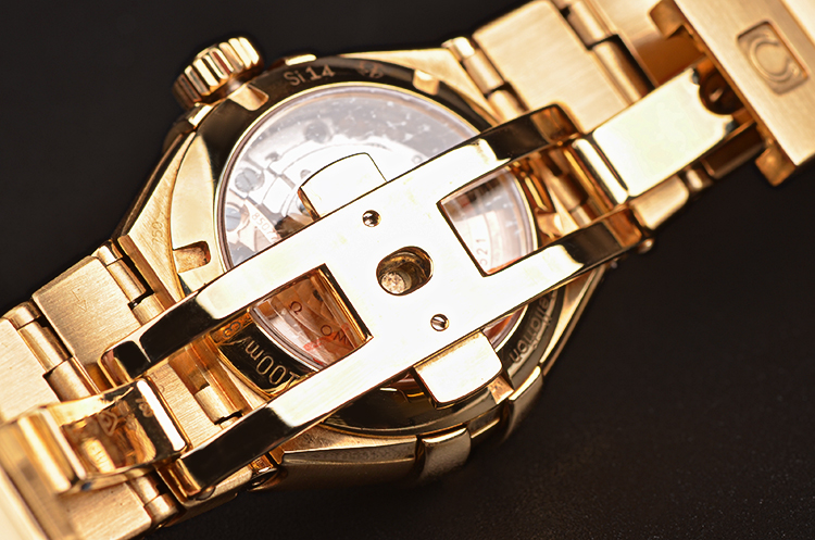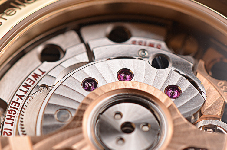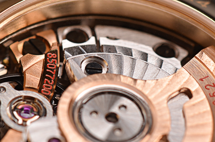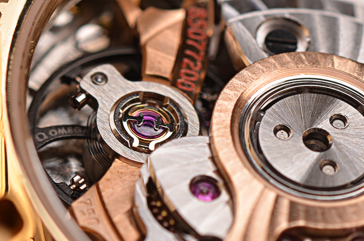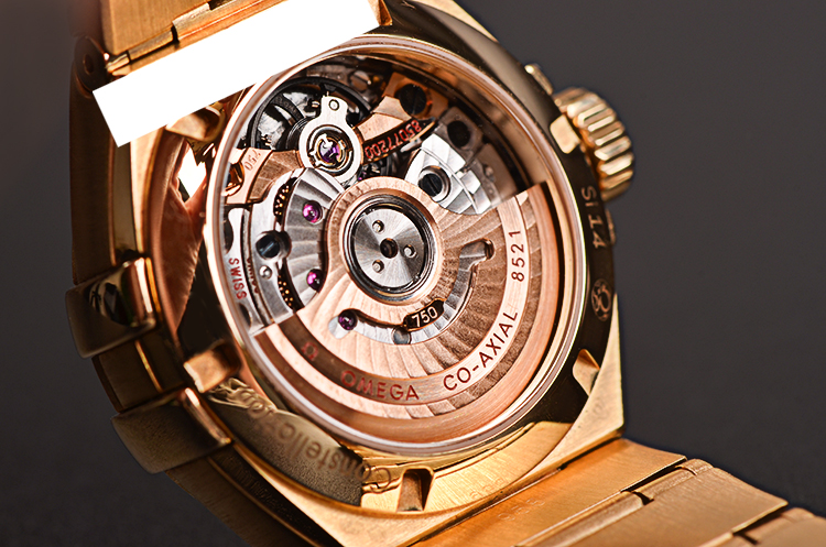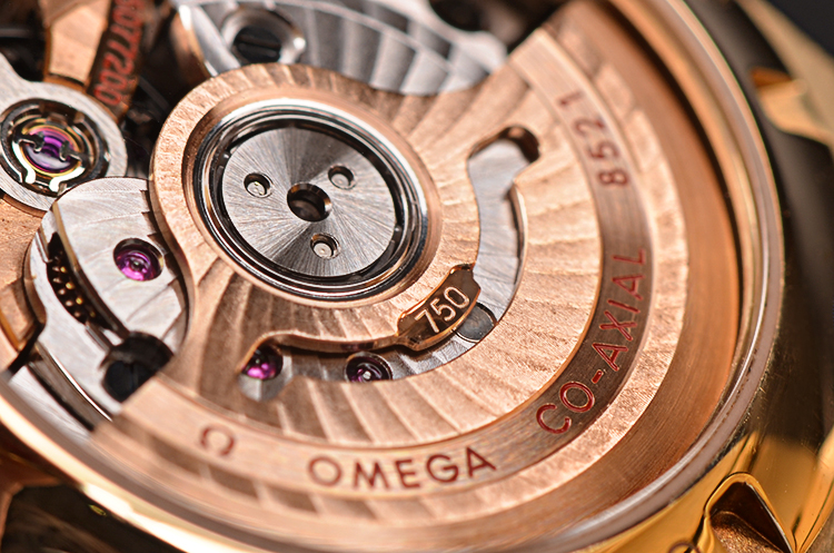 欧米茄自产CAL.8521型机芯,自动机械同轴机芯,极其精致日内瓦条纹打磨,新款硅游丝无卡度摆轮,倒角抛光修饰。18K玫瑰金镌刻自动转陀及摆轮夹板,28钻,摆频25200,动力储存约50小时,机芯独立签署,走时状态极嘉。