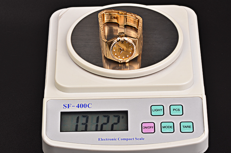 奢华18K黄金表壳及链带,18K黄金按压式双向折叠表扣。圣伯纳狗头印记。表圈原厂镶嵌32颗天然美钻(共计约0.5克拉),蓝宝石水晶镜面及底盖,带有太阳光芒射线的金色珍珠贝母面盘,夜光黄金指针,11颗原厂钻石时标(共计约0.12克拉),3点位日历显示功能。口径27MM*12MM,防水100M。