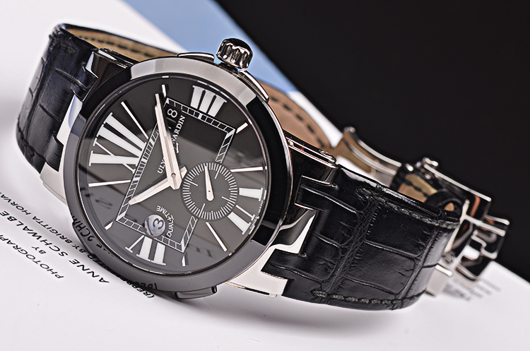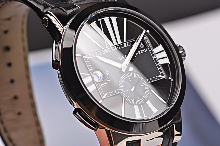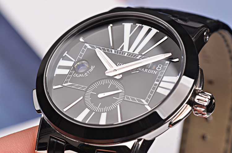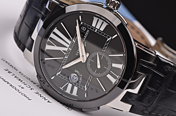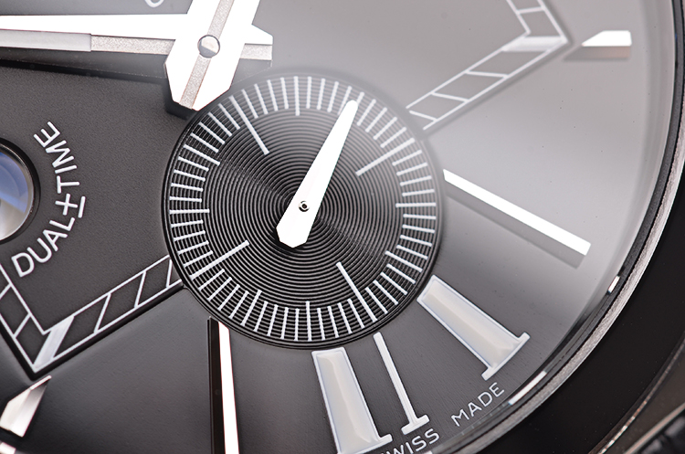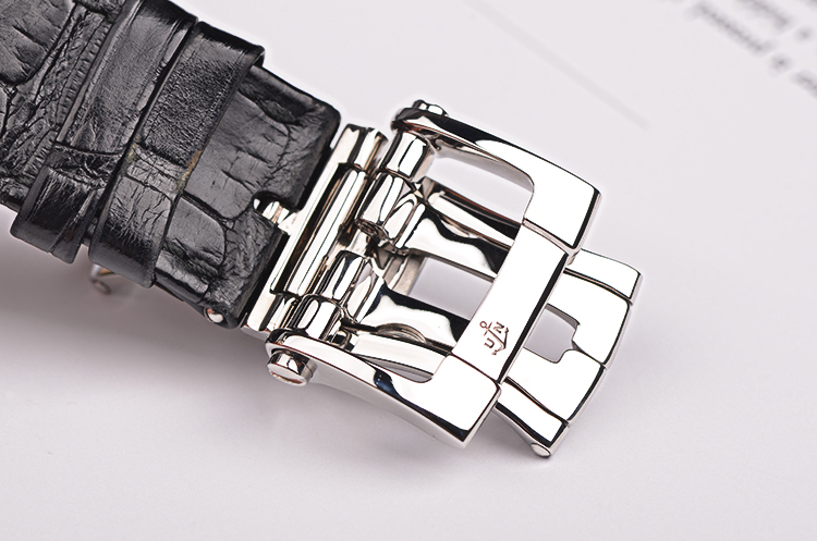 精钢表壳及按压式双向折叠表扣,后配黑色鳄鱼皮表带成色极新。蓝宝石水晶镜面及底盖,黑陶瓷表圈,立体黑色表盘,9点位放大镜视窗数显GMT第二时区,6点位独立小秒针,2点位大日历视窗,表壳侧面8点及10点位当前时区小时快调。旋入式防水锁把。口径43MM*12.8MM。防水100M。
