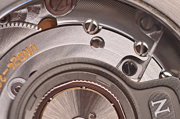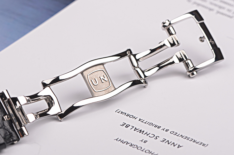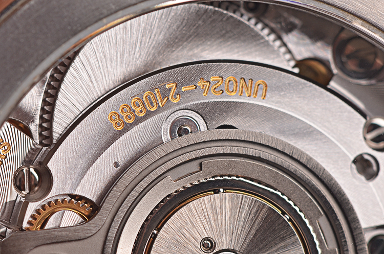 雅典自产的CAL.UN-24型机芯,自动机械,精致日内瓦条纹打磨,34钻,摆频28800,动力储备42小时,走时状态极嘉。