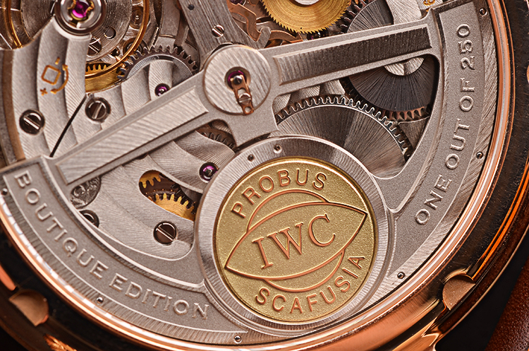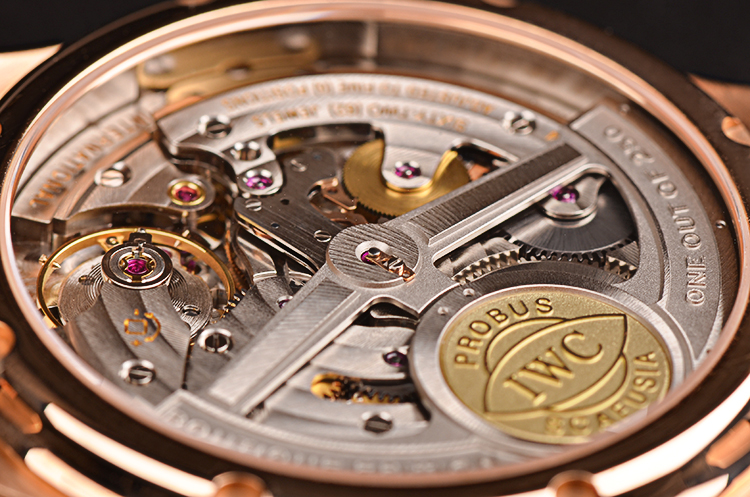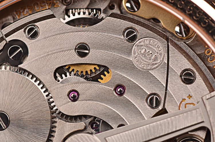 IWC自产的CAL.51614型机芯,自动机械,极其精致日内瓦条纹打磨,比勒顿上弦系统,宝玑游丝,自动摆陀饰以18K金质勋章,高达62钻,双发条盒,摆频21600,5方位校正,7天长动力储存。机芯有独立签署。走时状态极嘉。