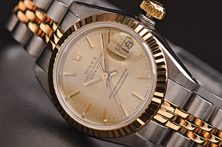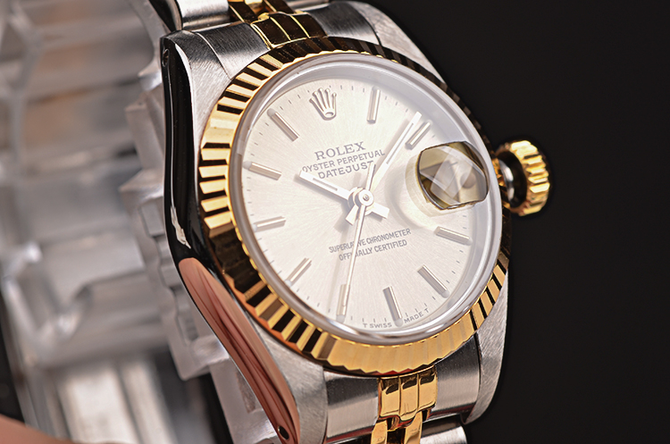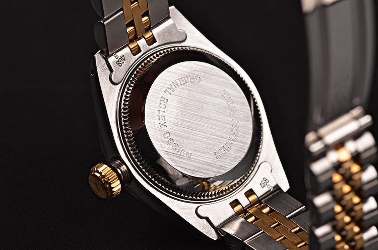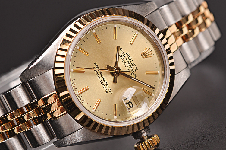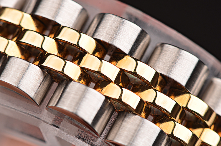904L精钢及18K黄金表壳及链带,18K黄金三角坑纹表圈。折叠式表扣。蓝宝石水晶镜面,立体金色表盘,黄金刻度及指针,3点位放大镜日历显示功能。旋入式防水表冠。口径26MM*11.8MM,防水100M。