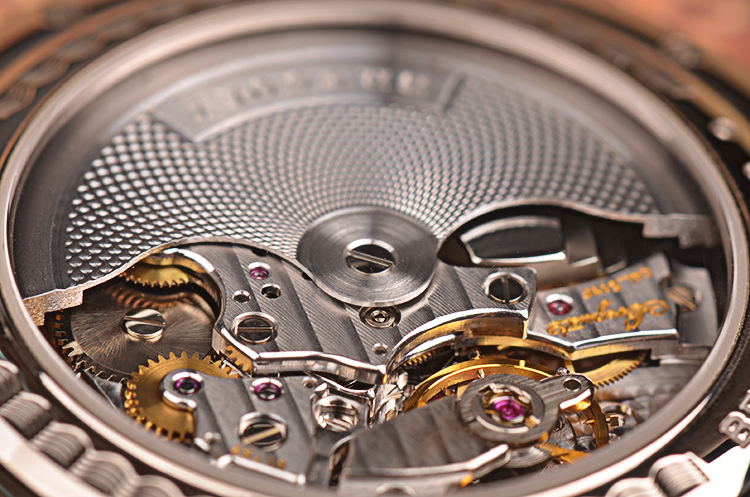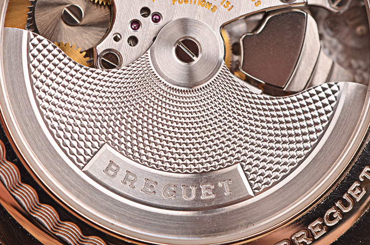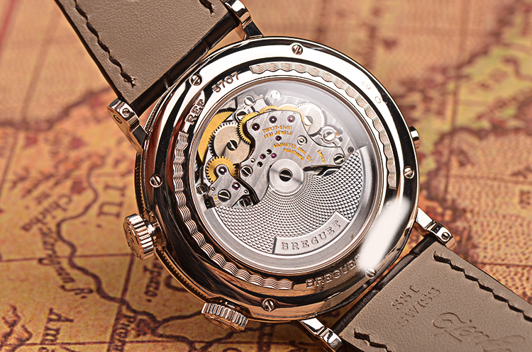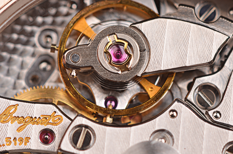宝玑自产的CAL.519F型机芯,自动机械,极其精致日内瓦条纹打磨,倒角抛光修饰,38钻,5方位校正,摆频28800,动力储存约45小时。18K白金镌刻自动转陀,机芯独立签署,走时状态极嘉。闹铃声音清脆悦耳。
