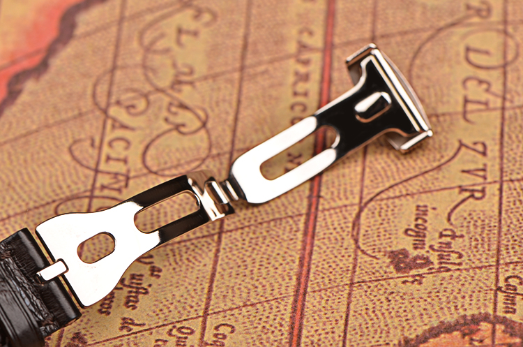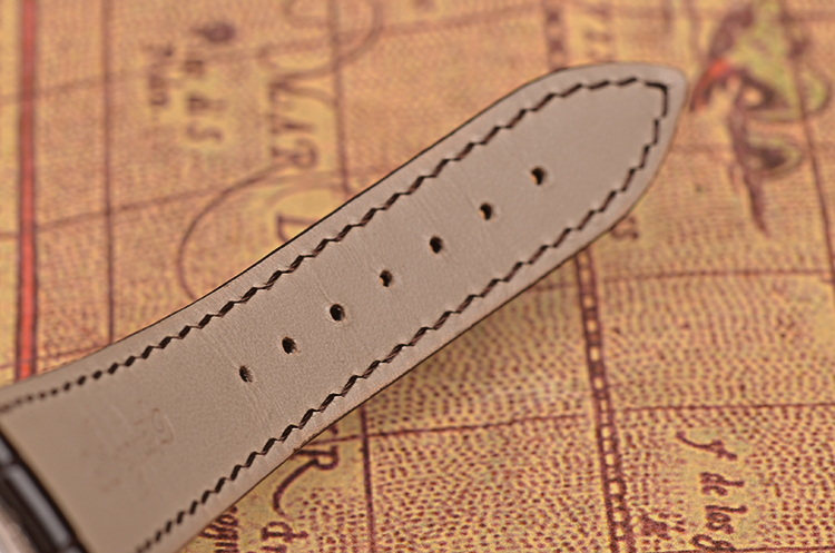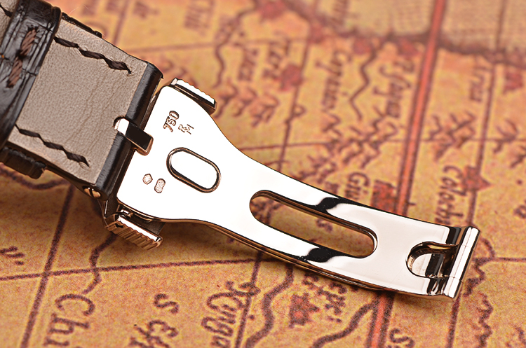 18K白金钱币纹表壳及折叠式表扣,圣伯纳狗头印记。后配全新深棕色鳄鱼皮表带。蓝宝石水晶镜面及底盖,立体手工镌刻白金镀银表盘,蓝钢宝玑指针,10点至12点位指针式闹铃动储显示,12点位闹铃开关状态显示,9点位指针式GMT第二时区显示,6点位独立小秒针及日历显示功能,3点位闹铃时刻显示。口径39MM*11.35MM。防水30M。